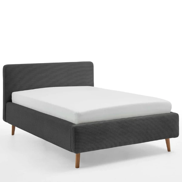 Bed Madras 221x161x105cm met bekleding in antracietkleurig ribfluweel met houten pootjes. Uitgerust met opbergruimte onder de lattenbodem. Geschikt voor matras 140x200cm, matras niet inbegrepen.
