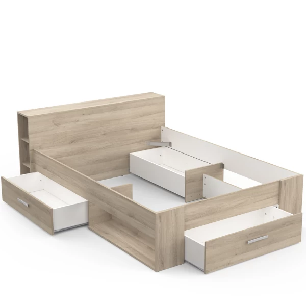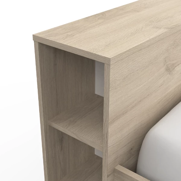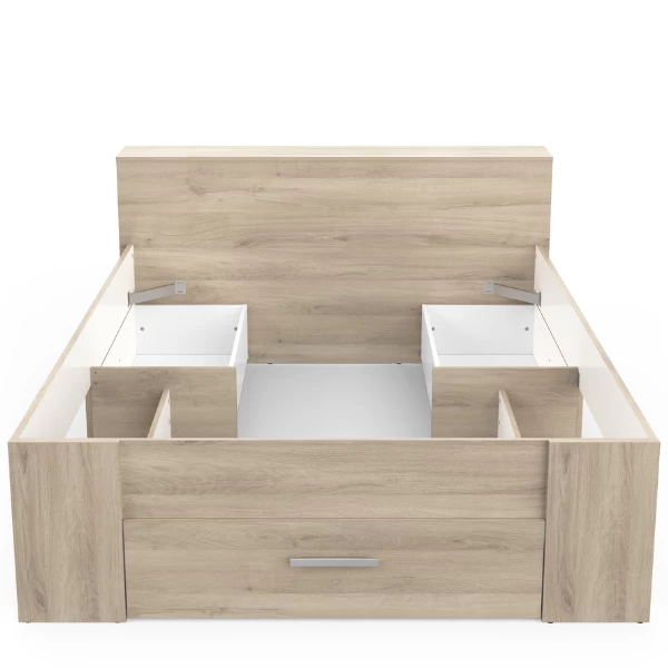 Creëer sfeer en gezelligheid in de slaapkamer met bed Polly in prachtig Kronberg eikdecor. De 6 open vakken aan de zijkanten van het hoofdbord werken ruimtebesparend aangezien u hierdoor geen nachtkastjes meer hoeft te voorzien. Op het hoofbord zelf kunt u wat decoratie plaatsen om uw slaapkamer te personaliseren. In de 3 lades onder het bed kunt u uw beddengoed opbergen en in de 2 open vakken is er nog plaats voor wat boeken of schoendozen. Bekijk onze website voor een bijpassende matras en bedbodem van 140 x 200 cm.