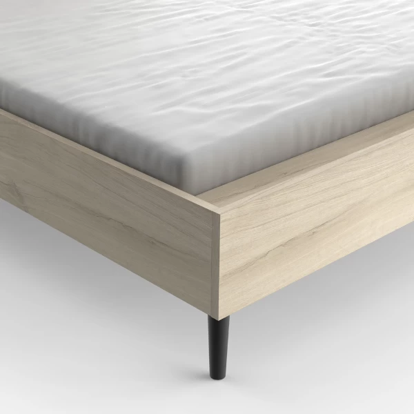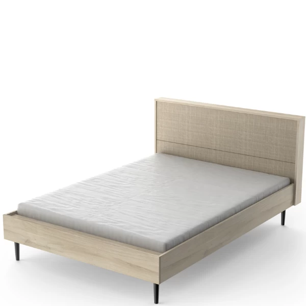 Bed Sayuri is gemaakt uit gemelamineerde spaanplaat in Kronberg eikdecor en wickerdecor. Matras en bedbodem van 140 x 190/200 cm niet inbegrepen.Â