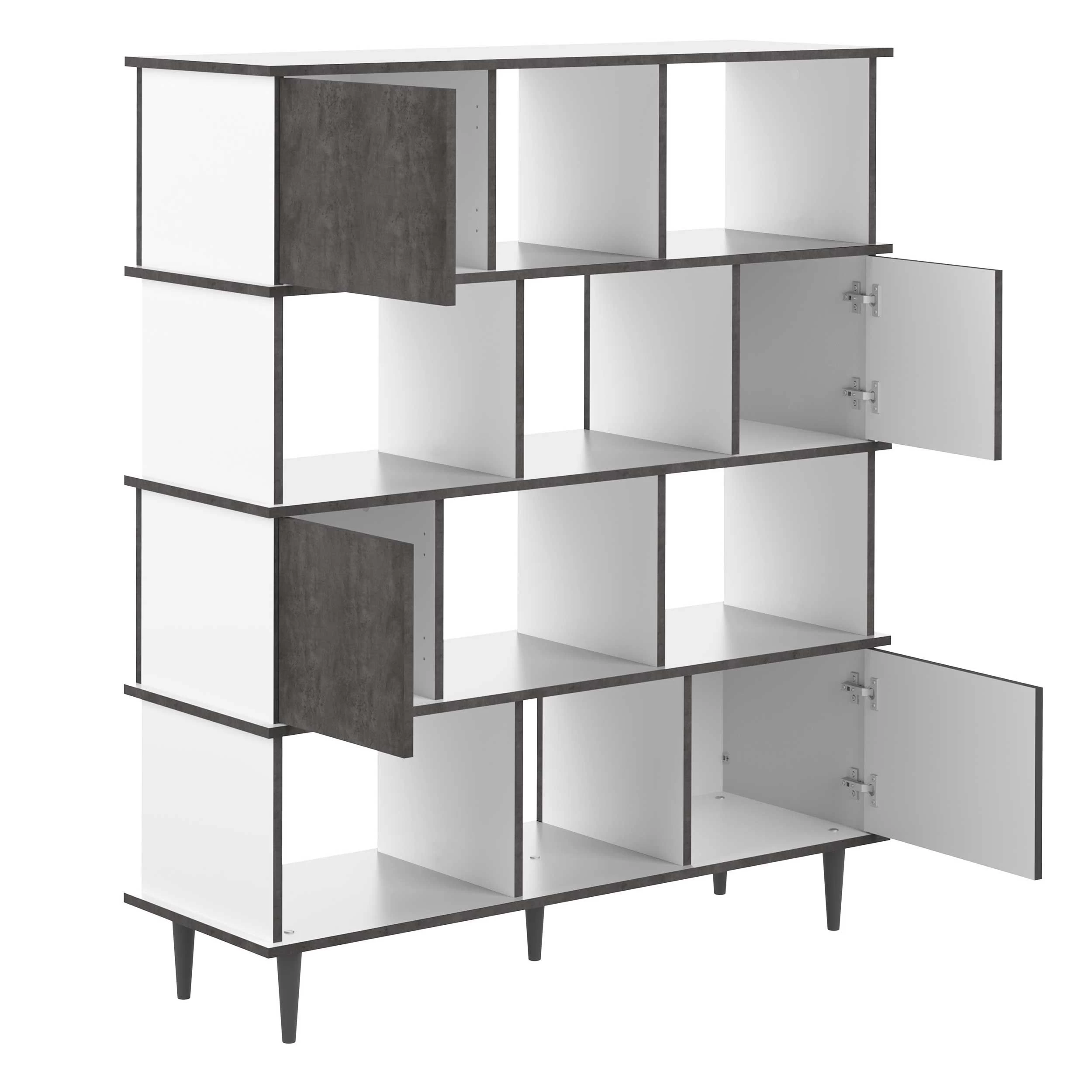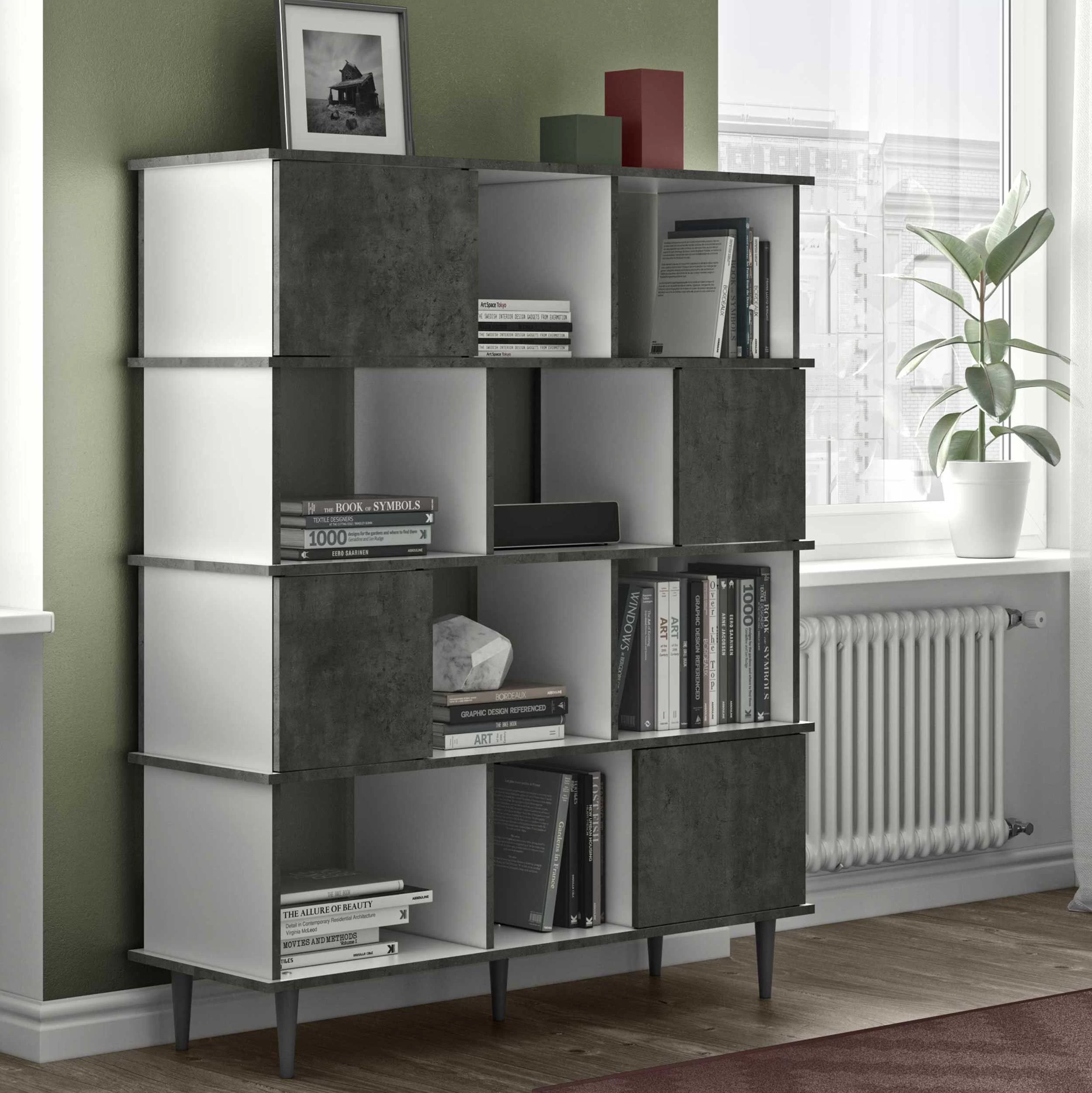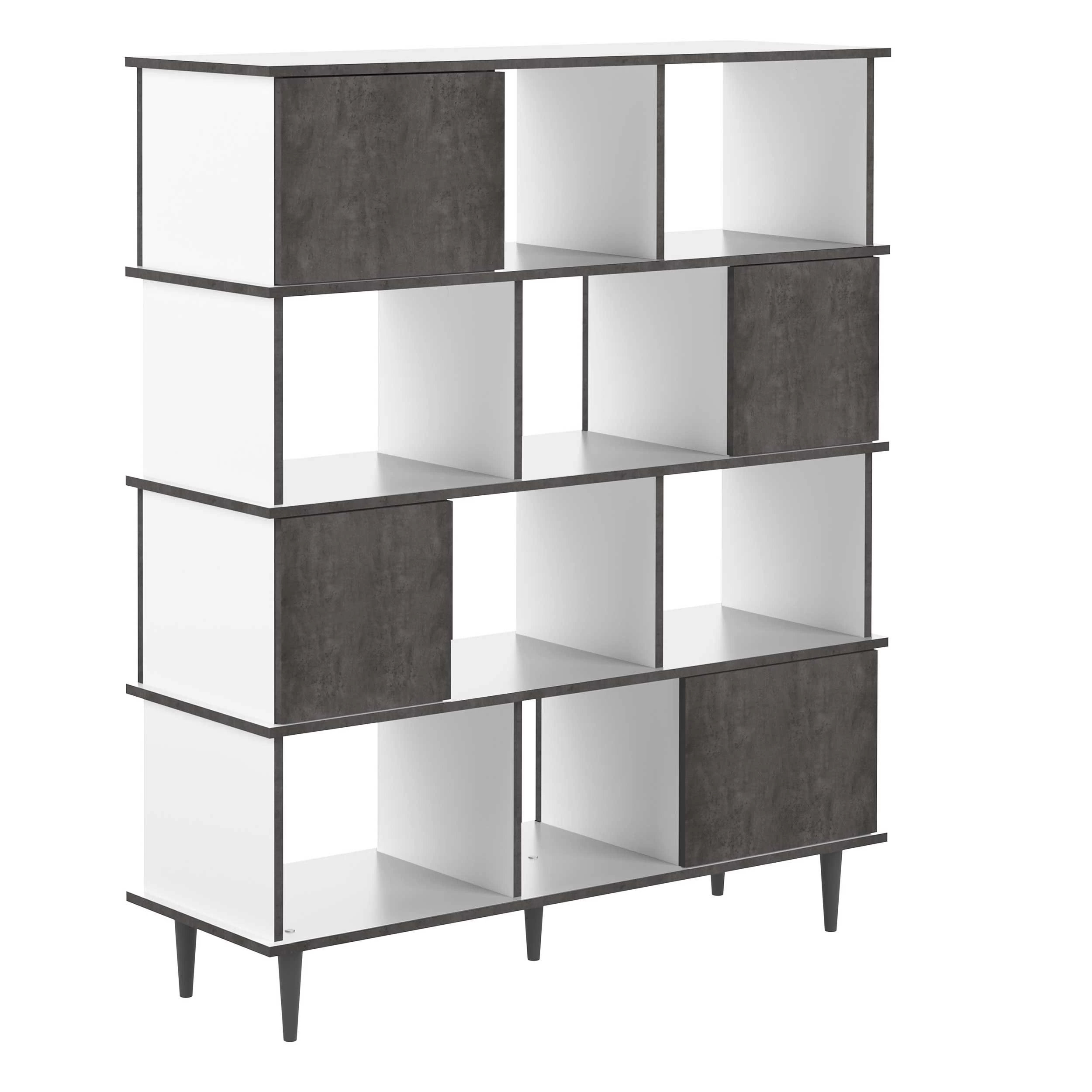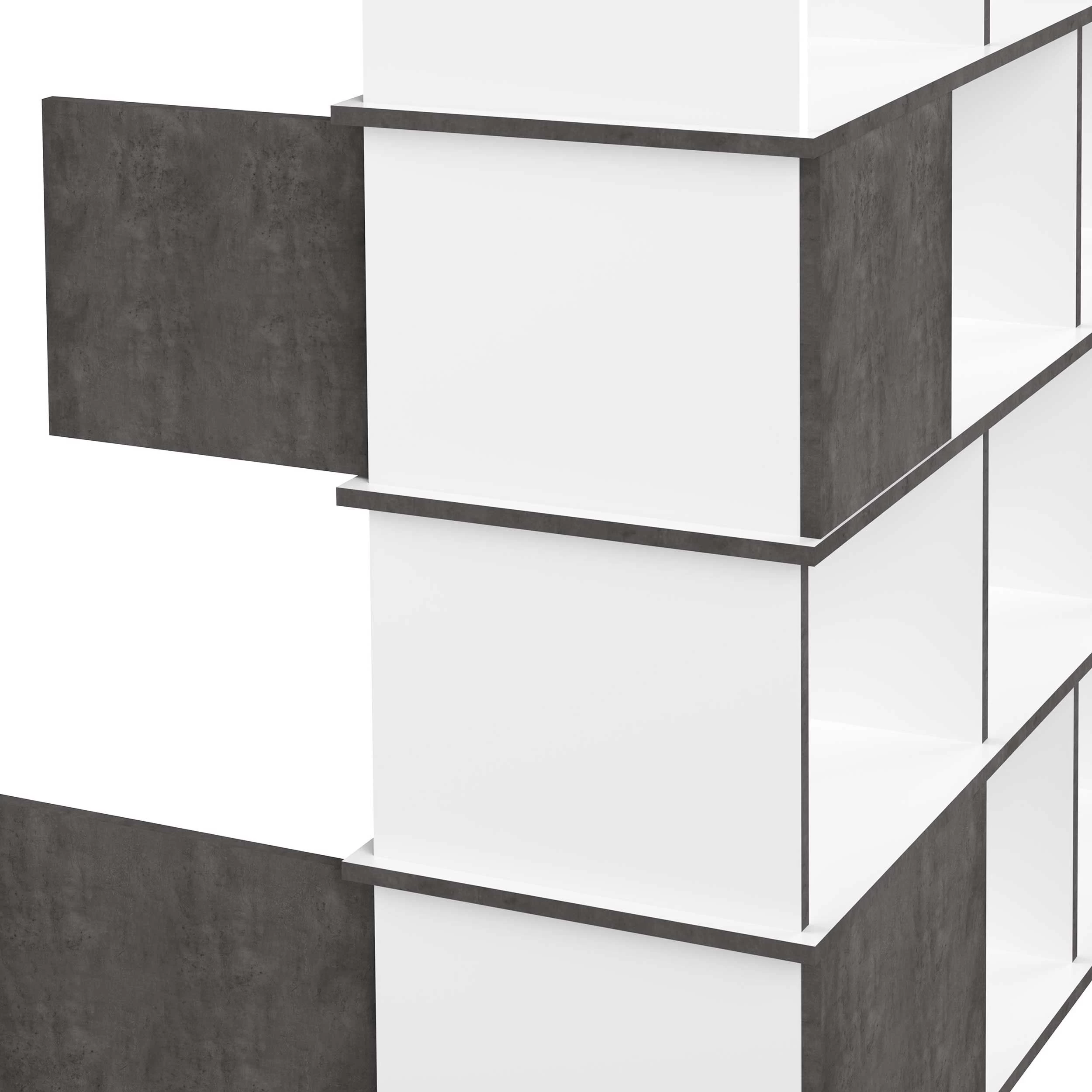 Witte boekenkast Fame met 8 open vakken en 4 kastjes in betonlook.