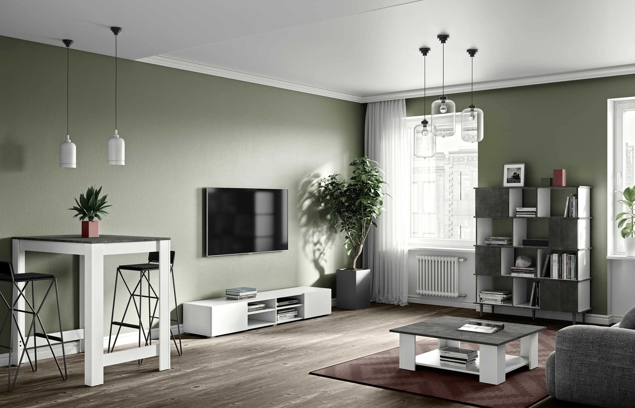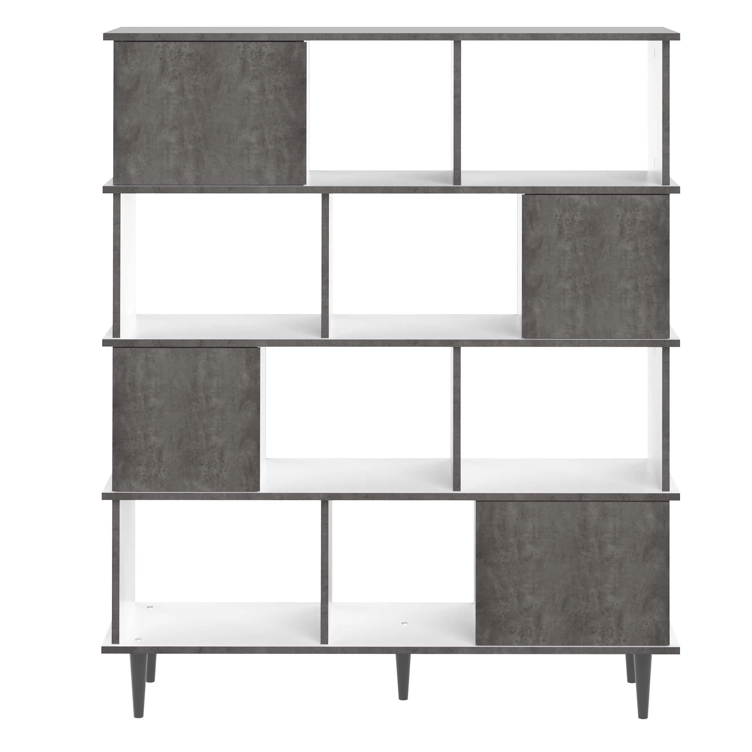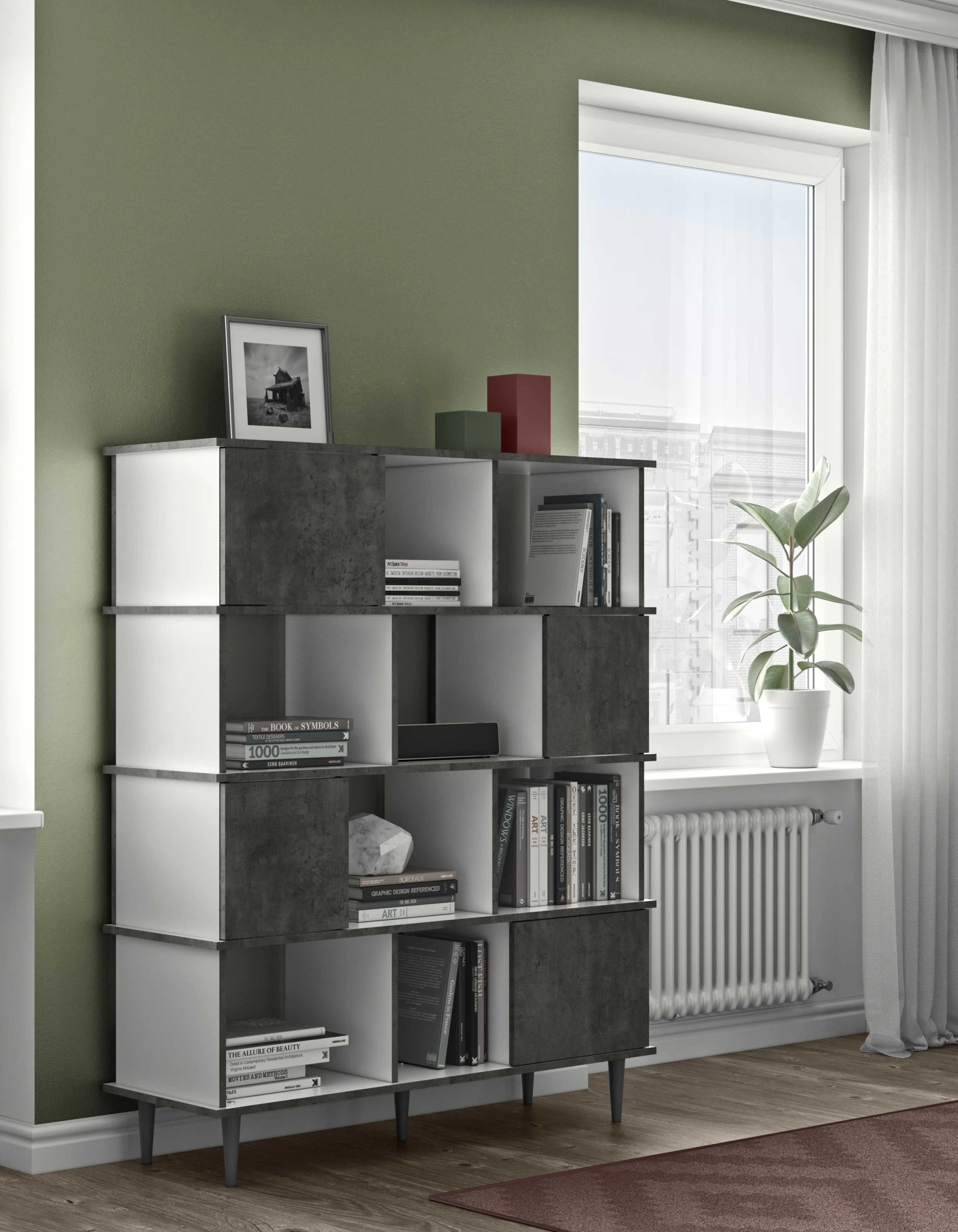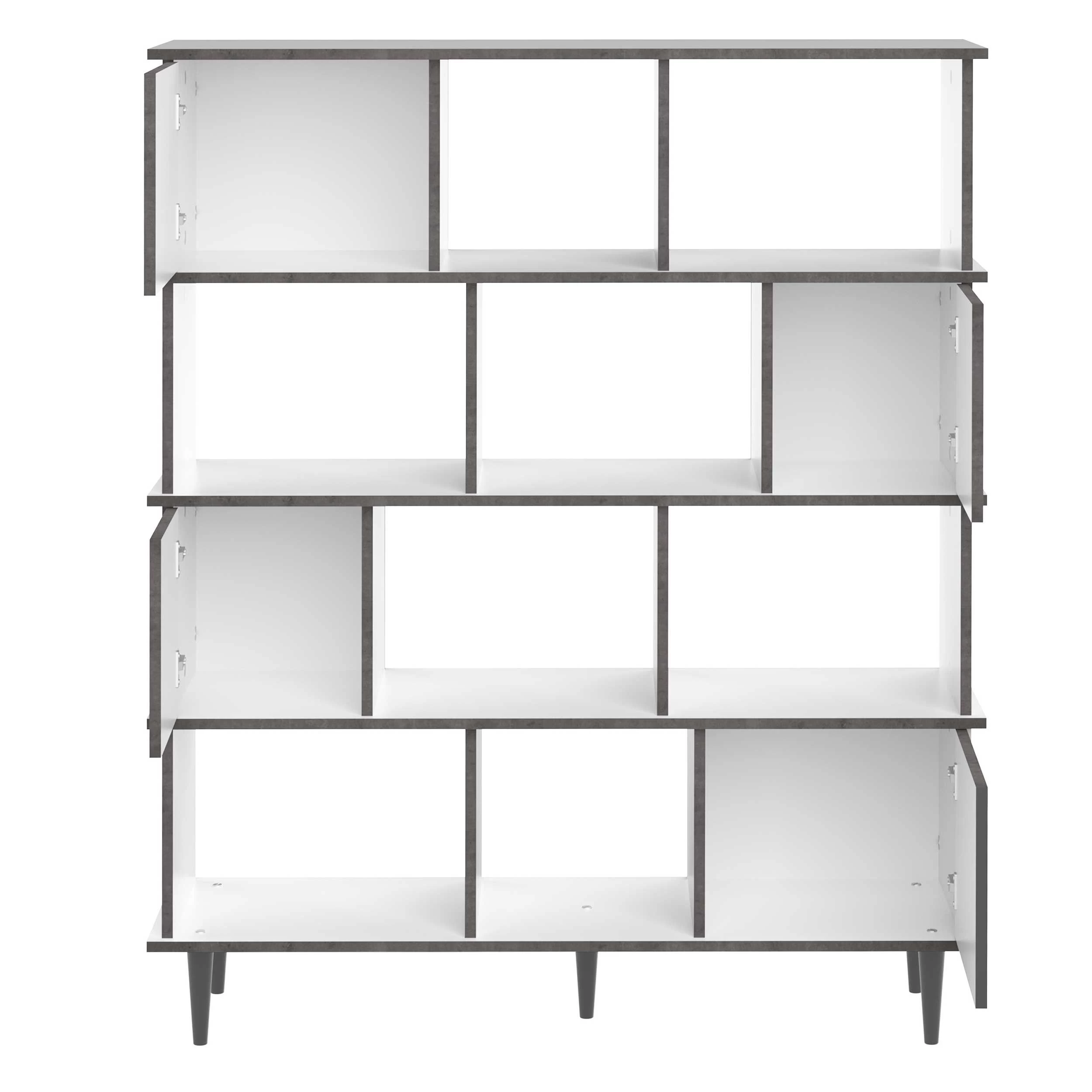 Witte boekenkast Fame met 8 open vakken en 4 kastjes in betonlook.