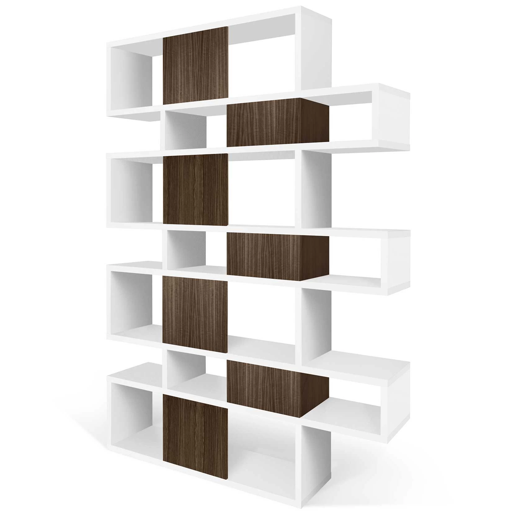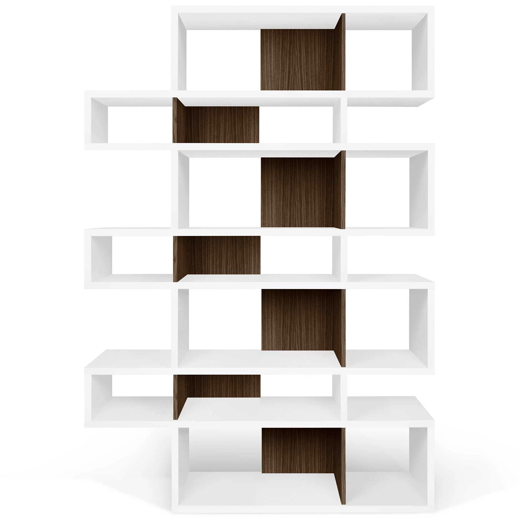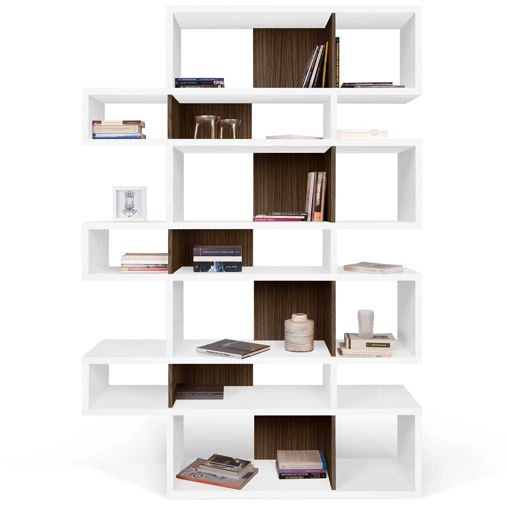 Deze boekenkast is gemaakt van wit gelakte MDF. Sommige compartimenten werden voorzien van een achterwand in walnootfineer. De kast is ingedeeld in 7 niveaus. Op elk niveau beschik je over een groot en een kleiner compartiment.