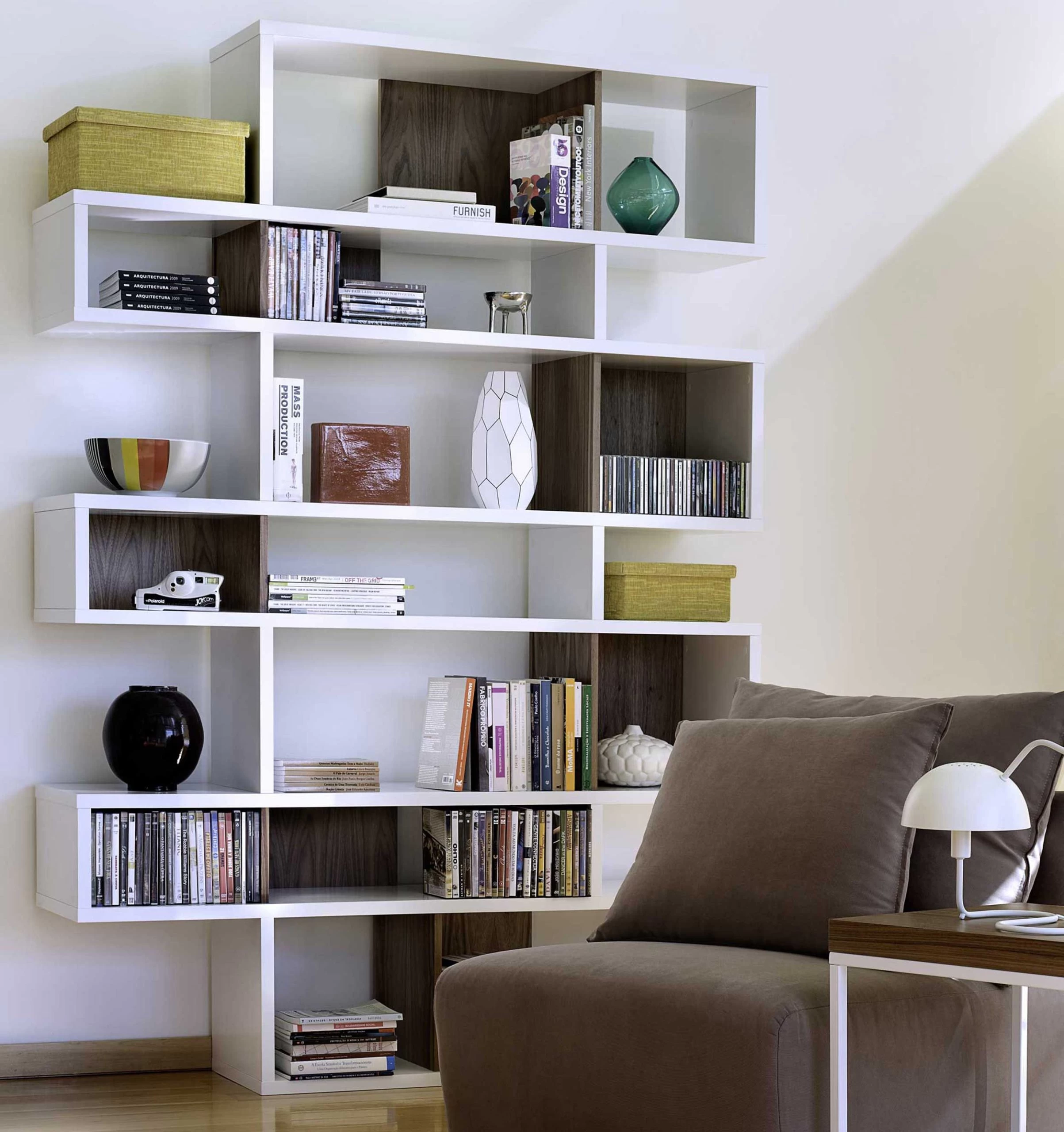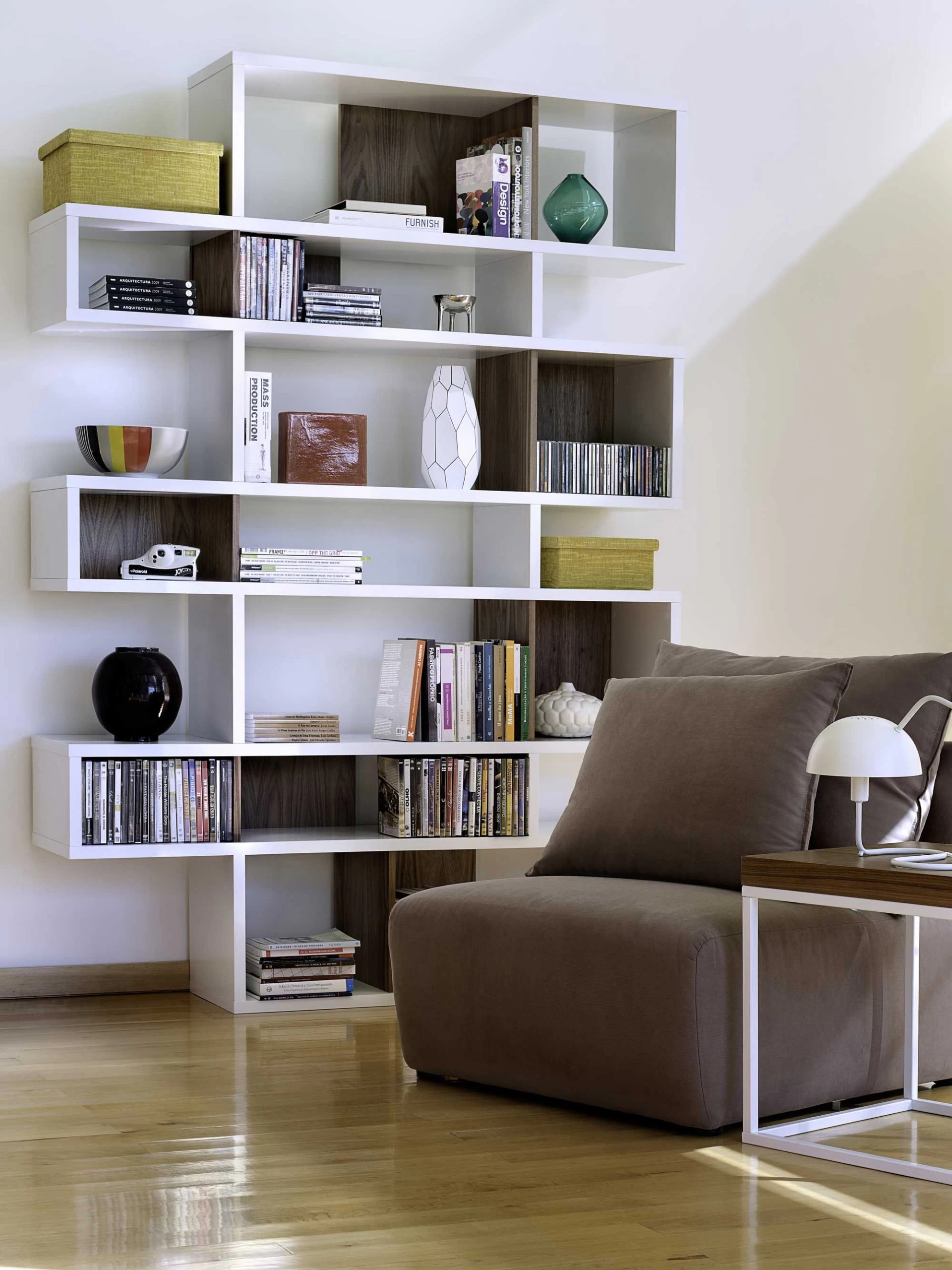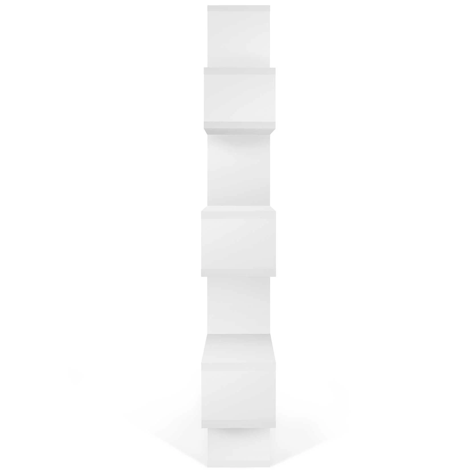 Deze boekenkast is gemaakt van wit gelakte MDF. Sommige compartimenten werden voorzien van een achterwand in walnootfineer. De kast is ingedeeld in 7 niveaus. Op elk niveau beschik je over een groot en een kleiner compartiment.