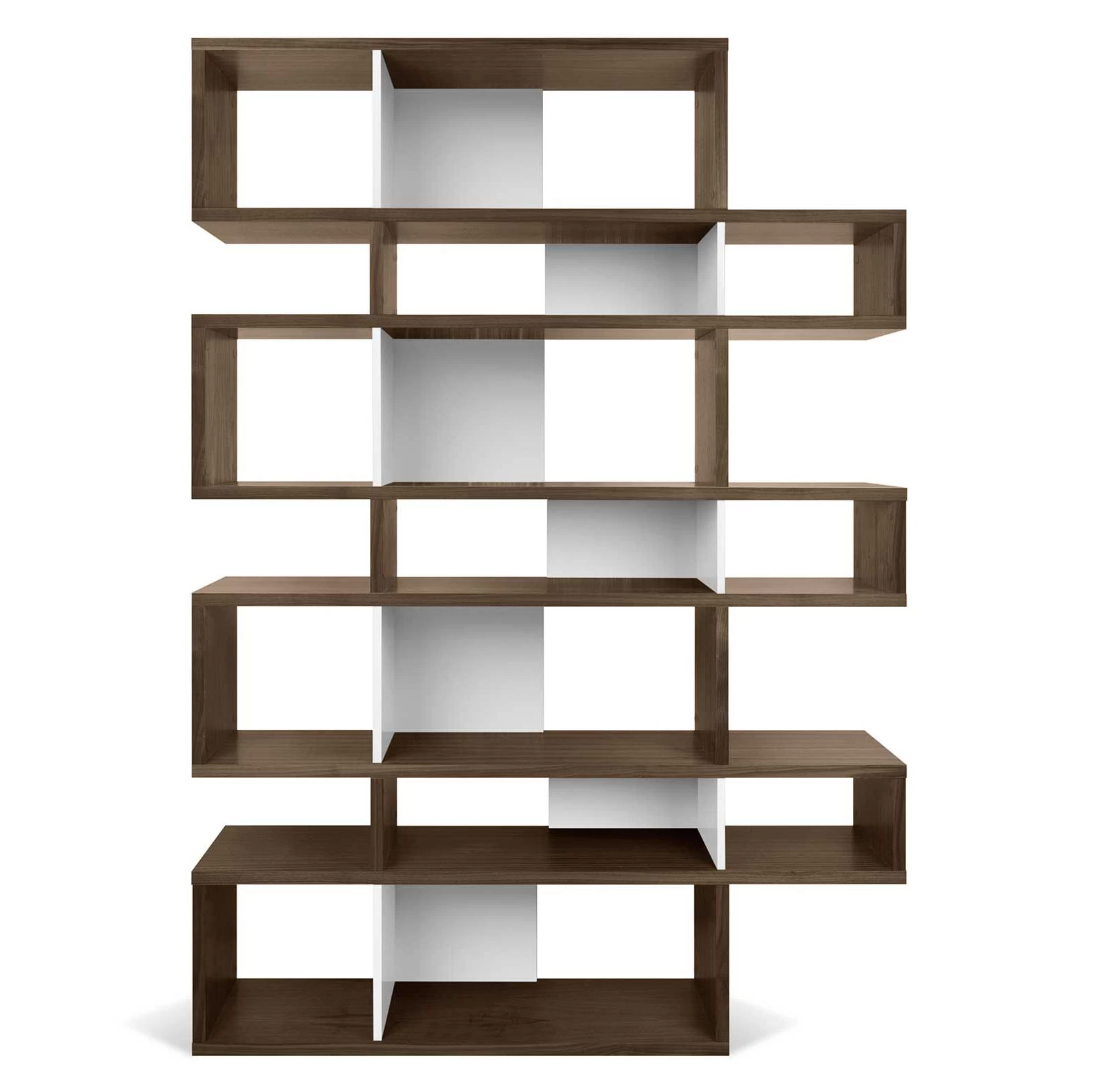 Deze boekenkast is gemaakt van MDF en werd afgewerkt met walnootfineer. Sommige compartimenten werden voorzien van een witte achterwand. De kast is ingedeeld in 7 niveaus. Op elk niveau beschik je over een groot en een kleiner compartiment.