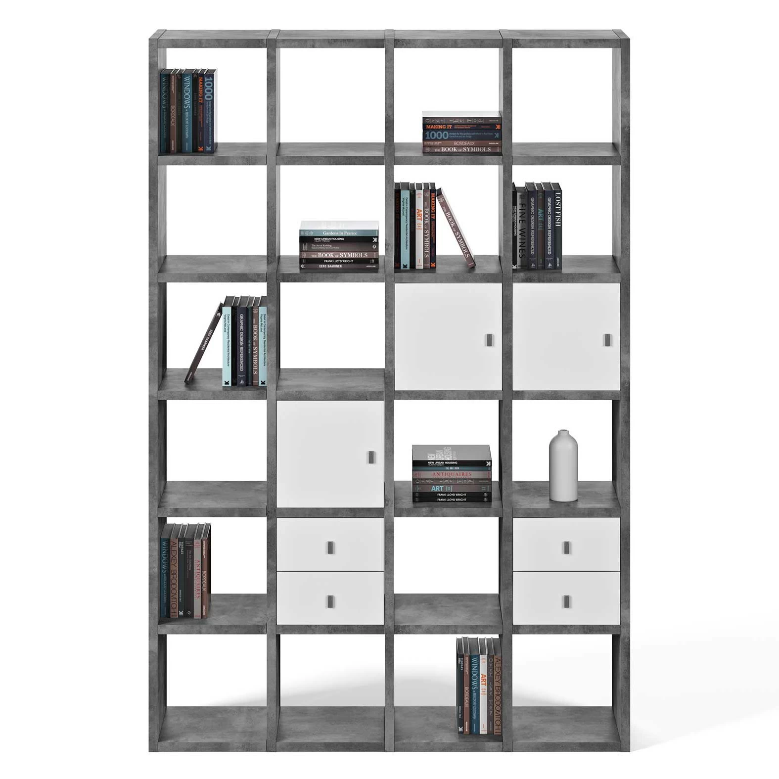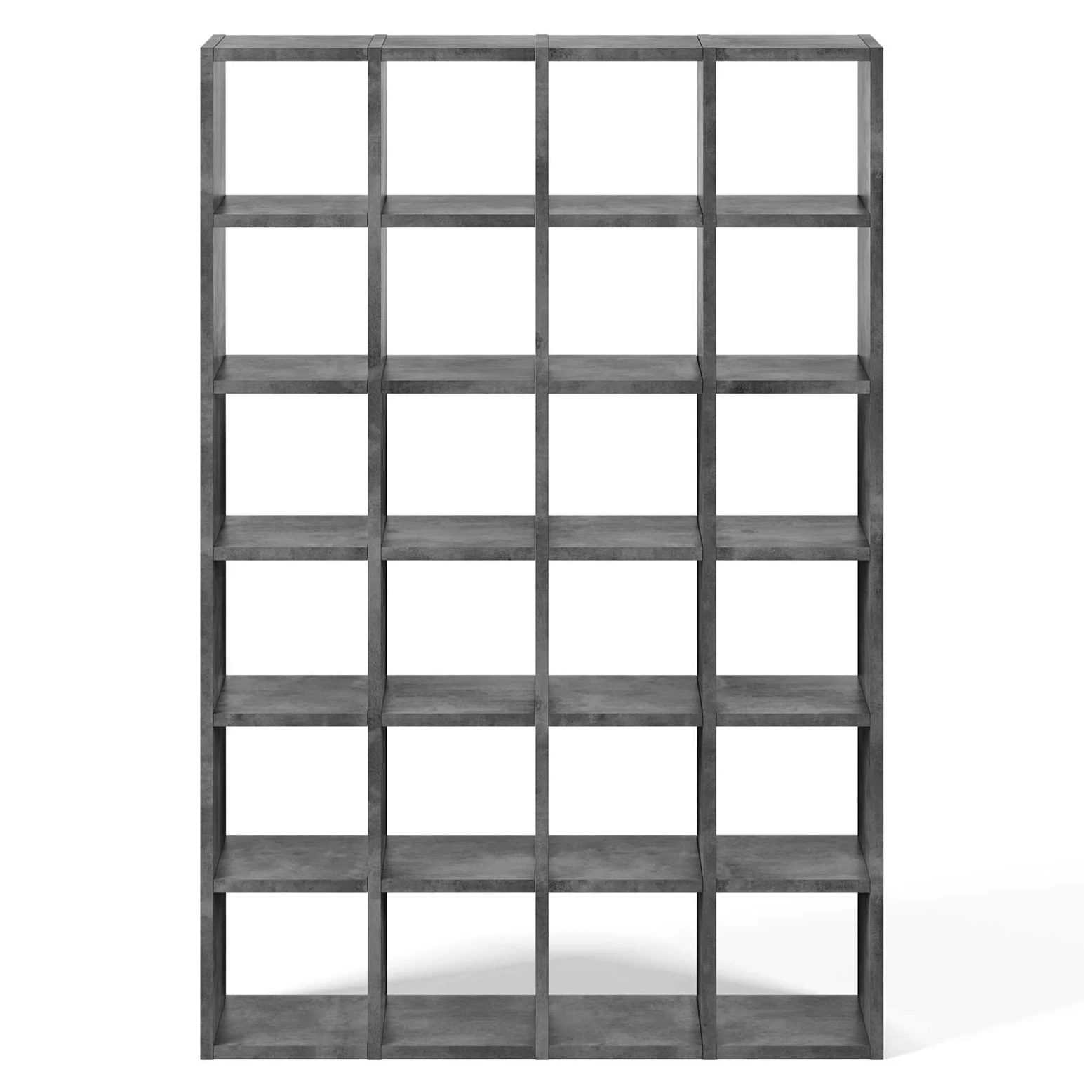 Dit rek is gemaakt van honingraatpaneel met betonlook. Het telt 24 vakken (afmeting: 33,8 x 34 cm).