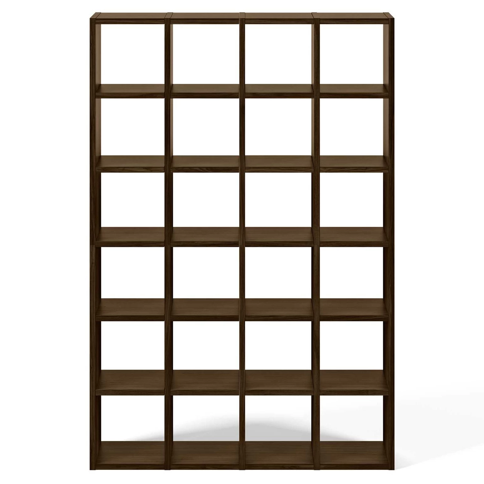 Dit rek is gemaakt van honingraatpaneel en kreeg een afwerking in walnootfineer. Het telt 24 vakken (afmeting: 33,8 x 34 cm).
