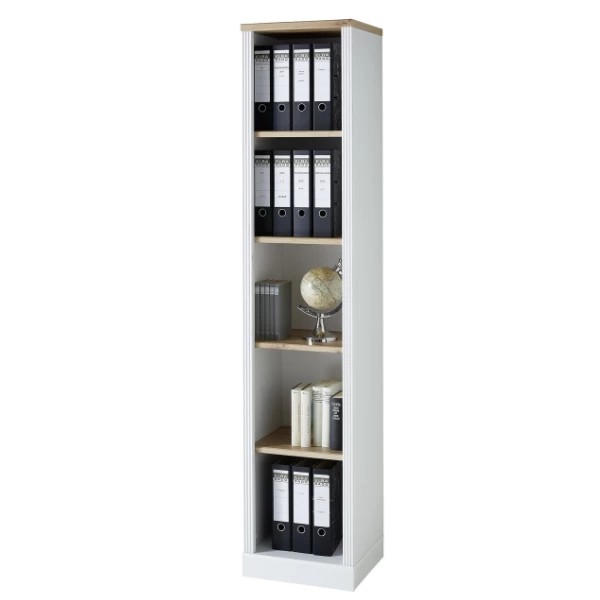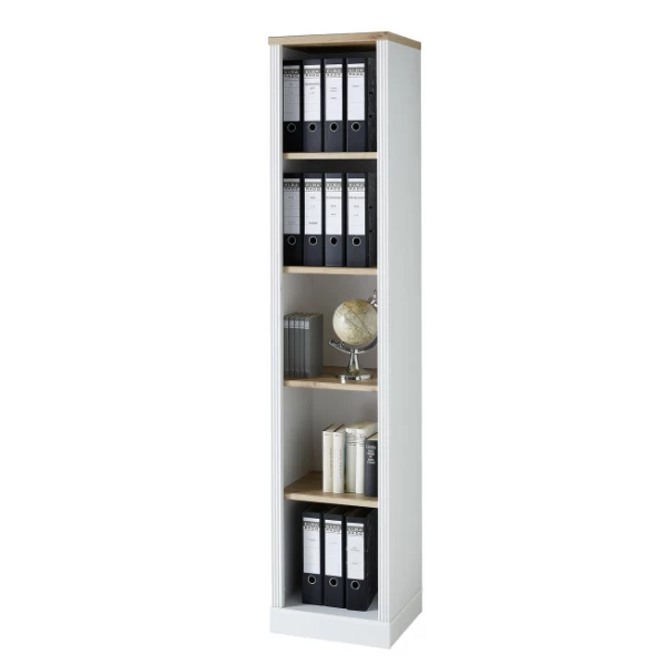 Ga voor de modern landelijke woonstijl met de meubelen van de Samine-reeks, die zijn gemaakt uit spaanplaat in wit en met afwerkingen in eikdecor. De reeks bestaat ook in grafietkleur. Deze boekenkast is voorzien van vier legplanken. Zo heb je voldoende plaats om boeken, dossiers en ordners te bewaren. Of fleur je kantoor wat op door er een leuke kamerplant of decoratiestuk in te plaatsen. Ontdek alles voor je kantoor op onze website.Â
