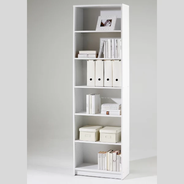 Dit elegante, slanke meubel is een moderne invulling van een boekenrek of open kast. Het meubel is praktisch, aangezien je het door zijn beperkte breedte overal in je huis kan plaatsen. De witte kleur van de spaanplaat, het materiaal waaruit het de kast is gemaakt, geeft een moderne aanblik. Je kan op de vijf legplanken, naast je favoriete boeken, op een overzichtelijke manier accessoires zoals fotokaders, dossiers of opbergmandjes wegbergen. Een rijzig meubel voor een klein prijsje!