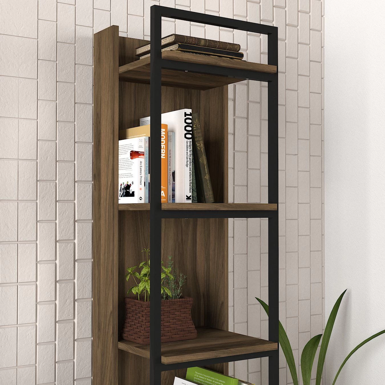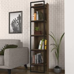 De Tera Home-boekenplank is een stijlvolle en stevige opbergoplossing gemaakt van 18 mm dik gemelamineerd spaanplaat, met een metalen frame. De afmetingen zijn 39cm (B) x 180cm (H) x 36cm (D). Kleur: Walnoot-zwart.