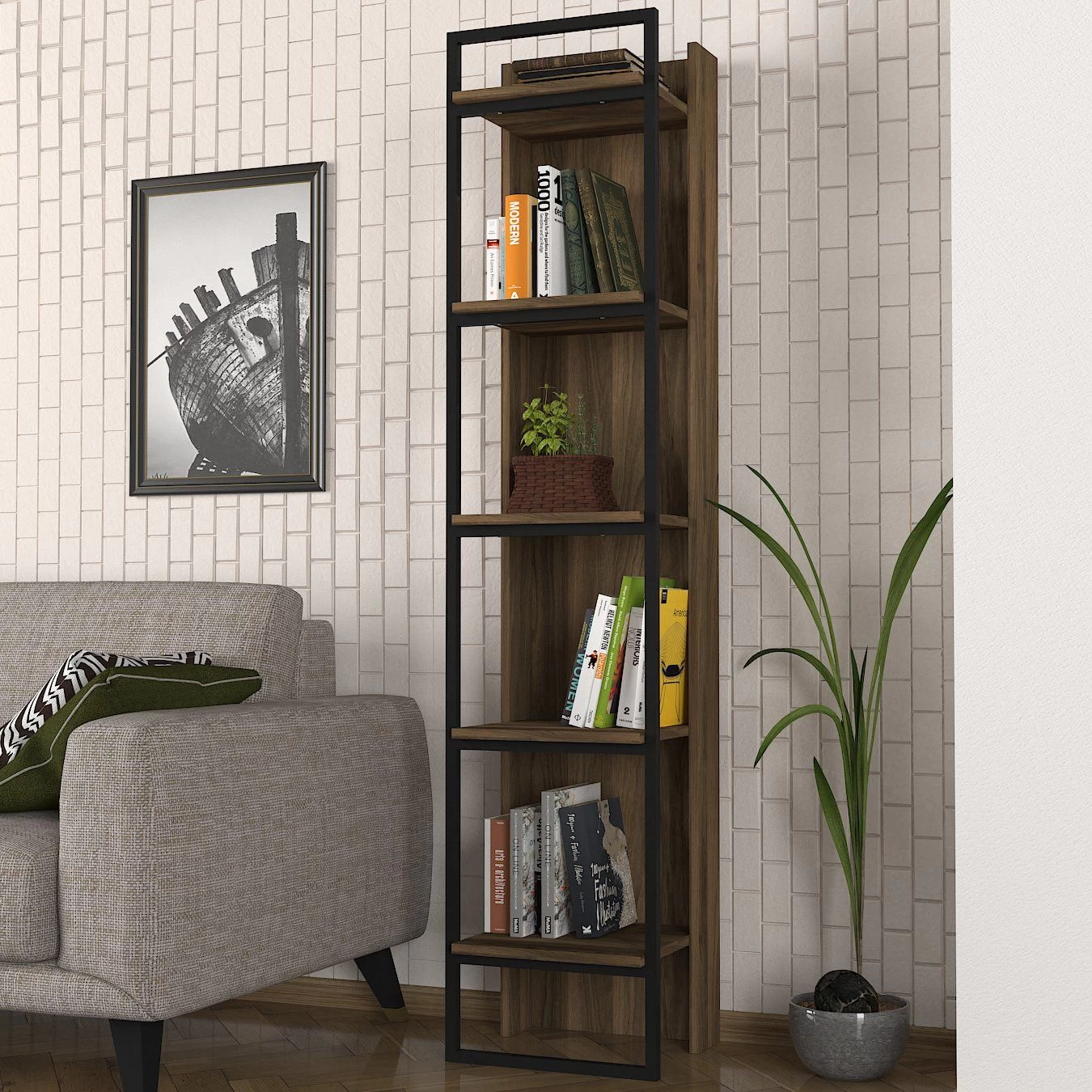 Maak kennis met de Tera Home boekenplank, gemaakt van de beste kwaliteit materialen en ontworpen om je interieur naar nieuwe hoogten te tillen. Gemaakt van 100% gemelamineerd spaanplaat, is deze boekenplank niet alleen visueel verbluffend maar ook gemaakt om lang mee te gaan. Met een dikte van 18 mm zorgt het voor uitzonderlijke stevigheid en duurzaamheid, zodat je er jarenlang op kunt vertrouwen. Een van de opvallendste kenmerken van de Tera Home boekenplank is het metalen frame, dat een vleugje moderne elegantie toevoegt en je dierbare boekencollectie een stevige ondersteuning biedt. Met een breedte van 39 cm, een hoogte van 180 cm en een diepte van 36 cm vormt deze boekenplank de perfecte balans tussen functionaliteit en stijl. Het compacte formaat maakt het ideaal voor kleine ruimtes, terwijl het toch voldoende opslagcapaciteit biedt voor je favoriete romans, woondecoratie, fotolijsten en meer.De walnoot zwarte kleur van de Tera Home boekenplank voegt een tijdloze, verfijnde touch toe aan elke kamer. Of je nu een eigentijdse of traditionele interieurstijl hebt, deze boekenplank past er naadloos bij, vult je bestaande meubels aan en verbetert de algehele esthetiek van je ruimte.De Tera Home boekenplank verbetert niet alleen de visuele aantrekkingskracht van je huis, maar biedt ook tal van voordelen. Het open schapontwerp zorgt voor eenvoudige organisatie en snelle toegang tot uw boeken en spullen. Zeg maar dag tegen rommelige ruimtes en hallo tegen een schone en georganiseerde leefruimte. Bovendien zorgt de melamine coating voor eenvoudig onderhoud, waardoor het bestand is tegen vlekken, krassen en dagelijkse slijtage.Investeren in de Tera Home boekenplank betekent investeren in kwaliteit en functionaliteit. De hoogwaardige constructie en het doordachte ontwerp maken het een betrouwbare en duurzame opbergoplossing voor thuis of op kantoor. Creëer een gezellig leeshoekje, laat uw favoriete literaire werken zien of stel uw dierbare verzamelobjecten stijlvol tentoon.Upgrade uw leefruimte met de Tera Home boekenplank, het toppunt van elegantie, functionaliteit en duurzaamheid. Ervaar het plezier van een goed georganiseerde kamer en maak een statement met dit prachtige meubelstuk. Haal uw Tera Home boekenplank vandaag nog in huis en verander uw huis in een oase van stijl en verfijning.