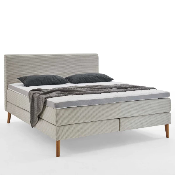 Boxspringbed Sirocco 212x182x116cm met houten pootjes en bekleding in beige ribfluweel. Voorzien van een pocketveringmatras van 180x200cm.Â