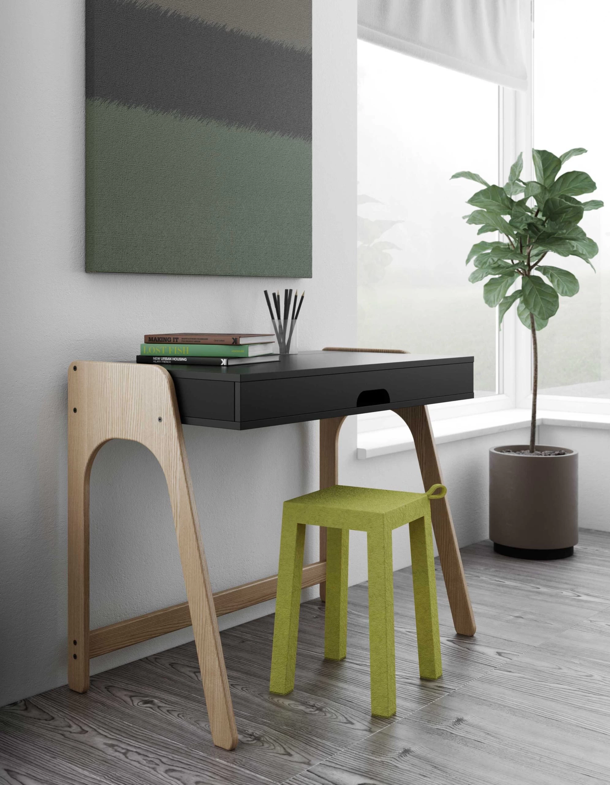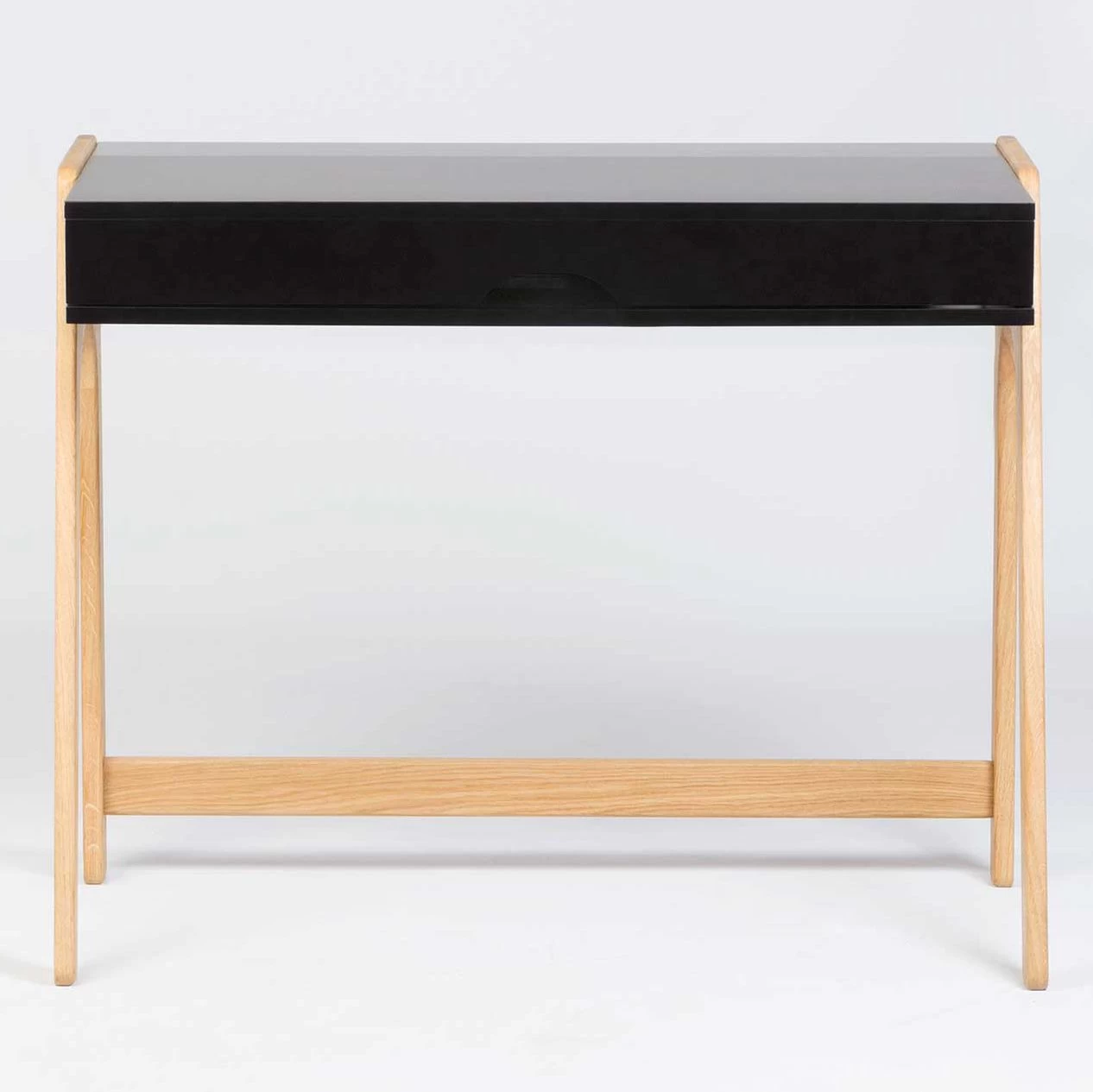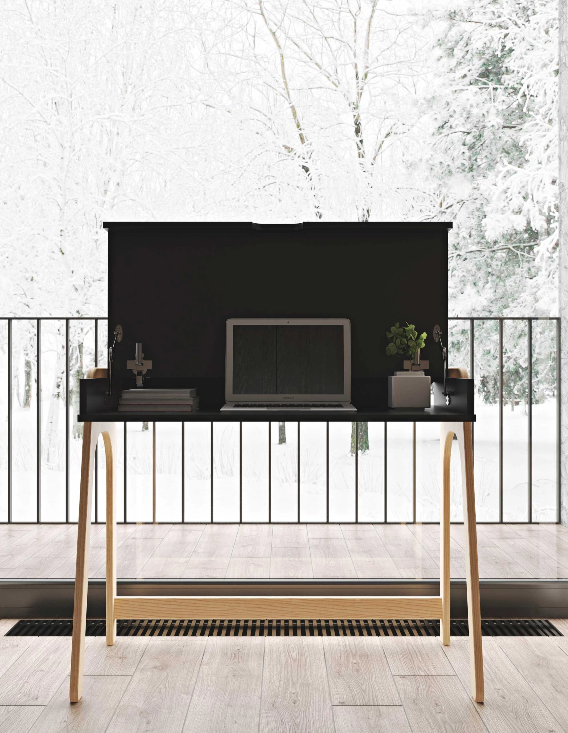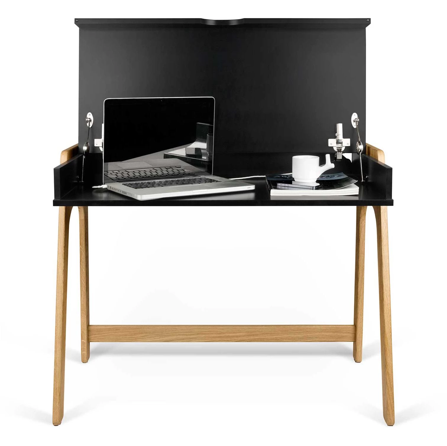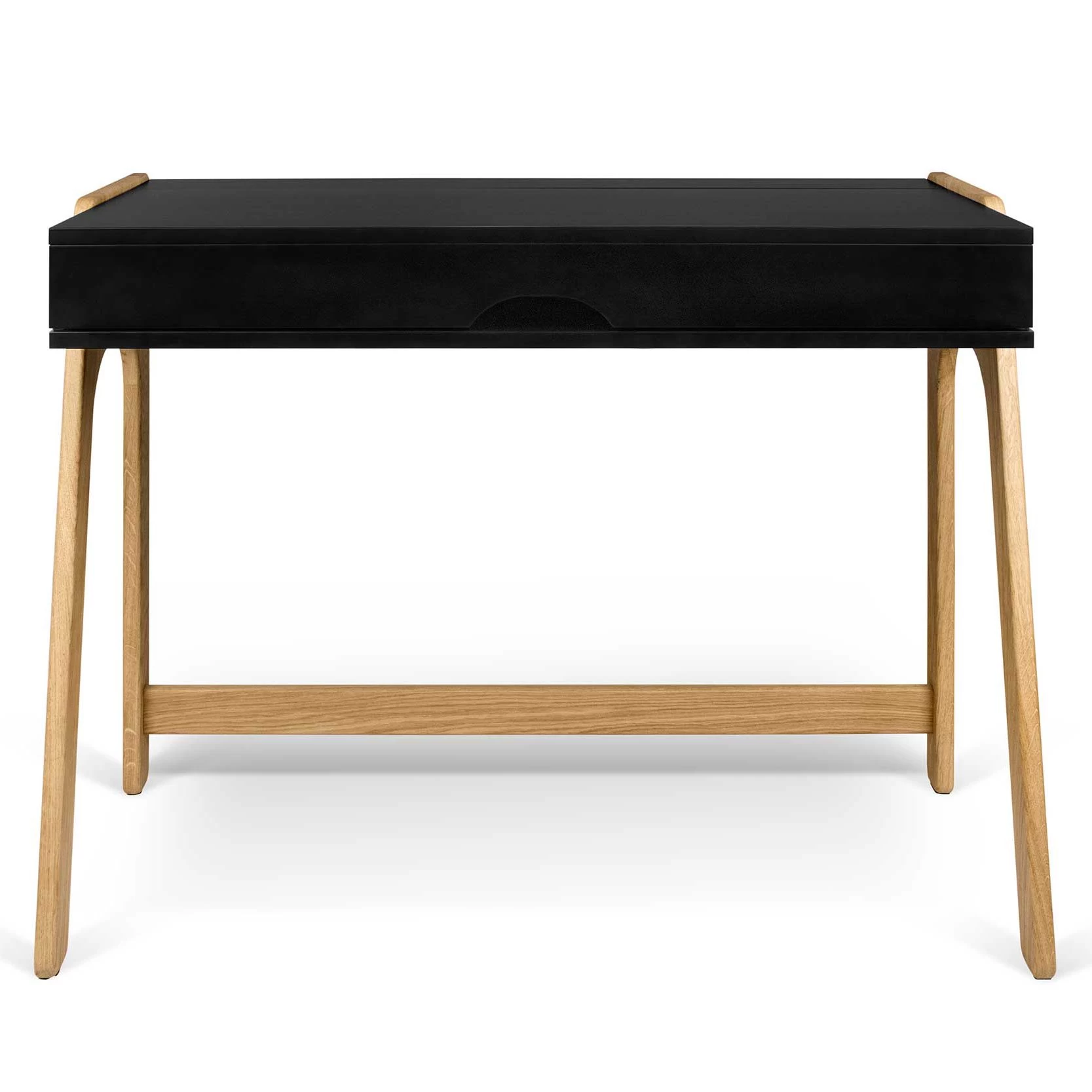 Bureau Aura met zwart opklapbaar bureaublad en massief eiken poten.