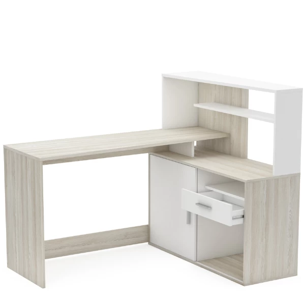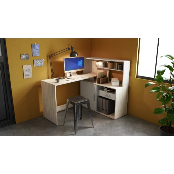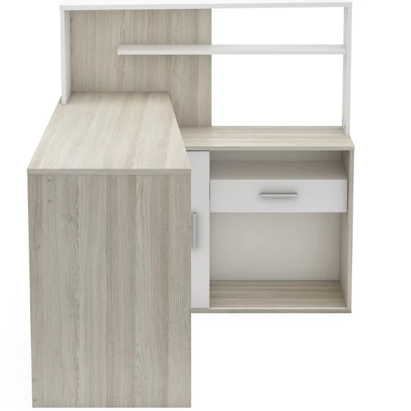 Dit trendy bureau biedt u alles wat u nodig heeft om efficiënt te kunnen werken. Er is een lade voor uw schrijfgerief, een handige plaats besparende schuifdeur met daarachter opbergruimte voor uw boeken en dossiers, een 3-tal nissen voor uw schriftjes, notitieblokjes en mappen en een open legplank waar u ook nog heel wat spulletjes kwijt kunt. Door al deze opbergruimte blijf uw werkblad ten alle tijde vrij waardoor u in alles rust kunt werken.Â