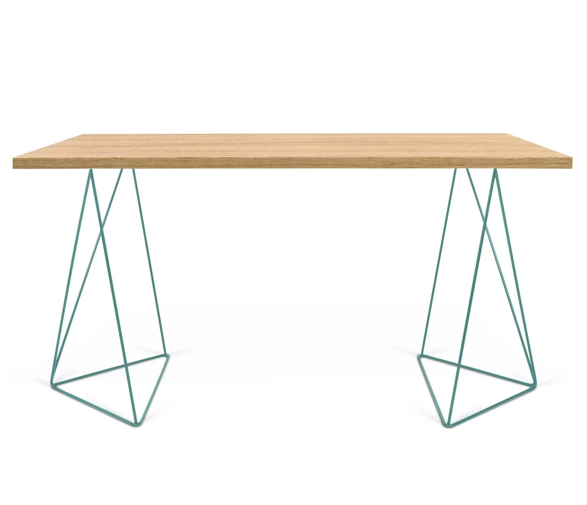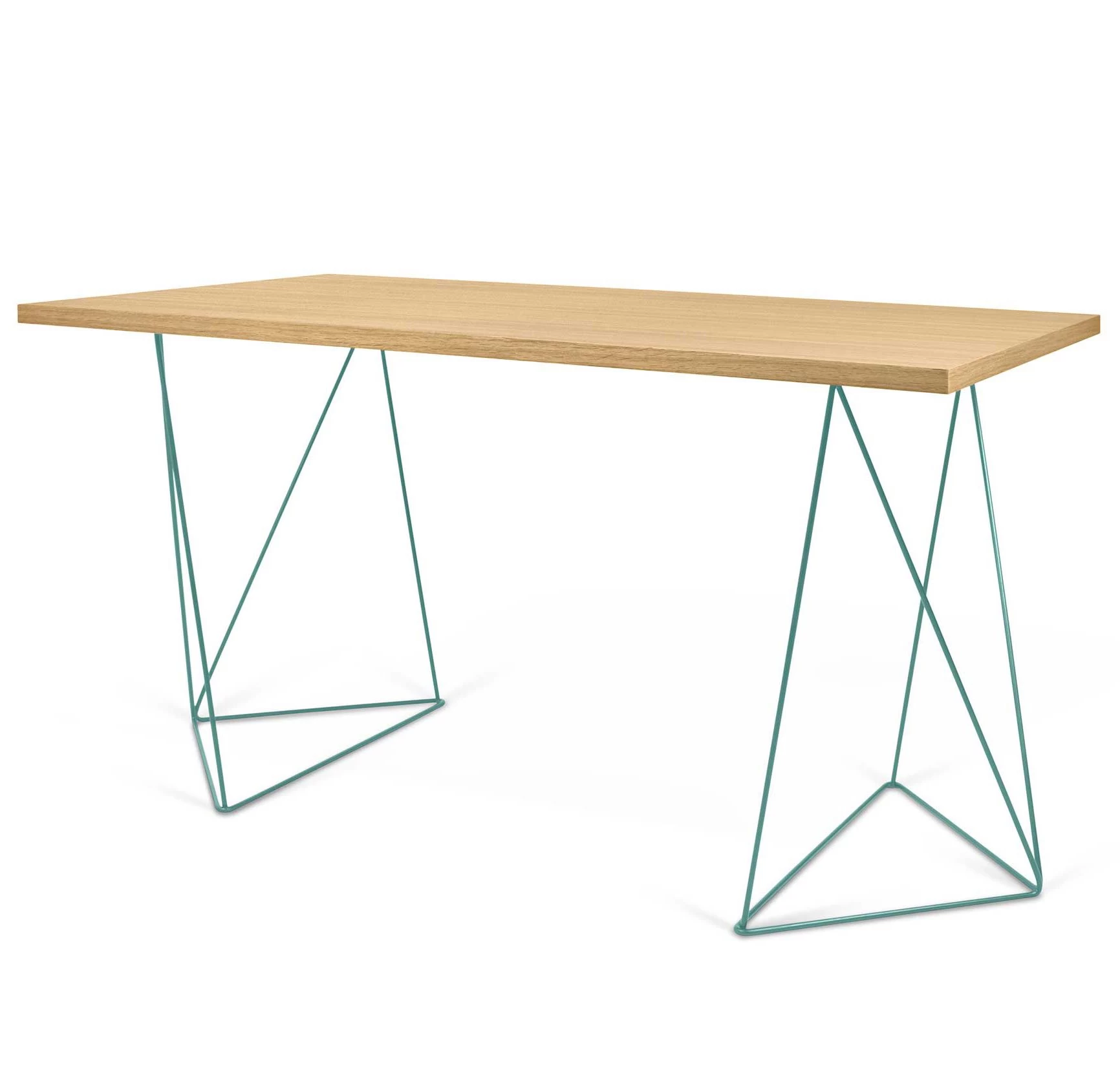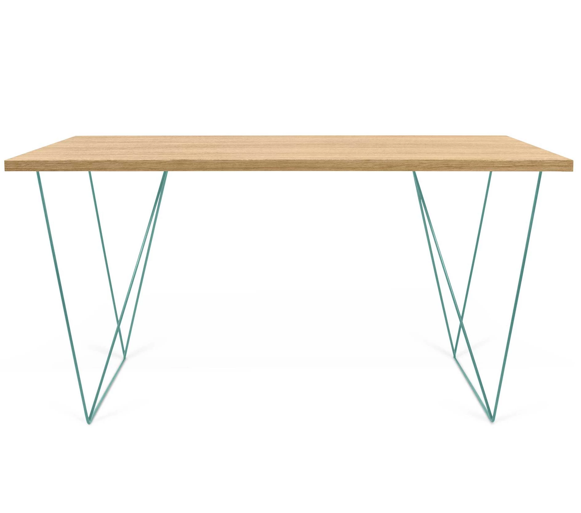 Bureau Flo uit hoogwaardige MDF, blad afgewerkt met laagje fineer van wilde eik. Groene geometrische pootjes op verschillende manieren te monteren.