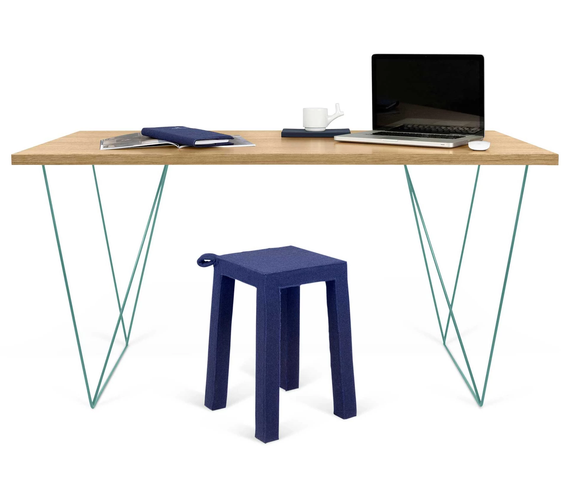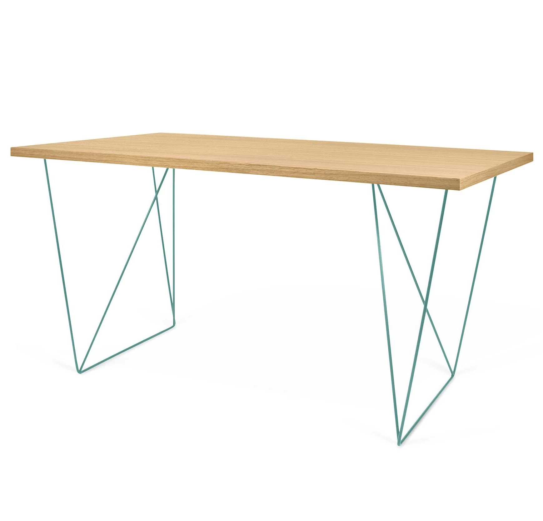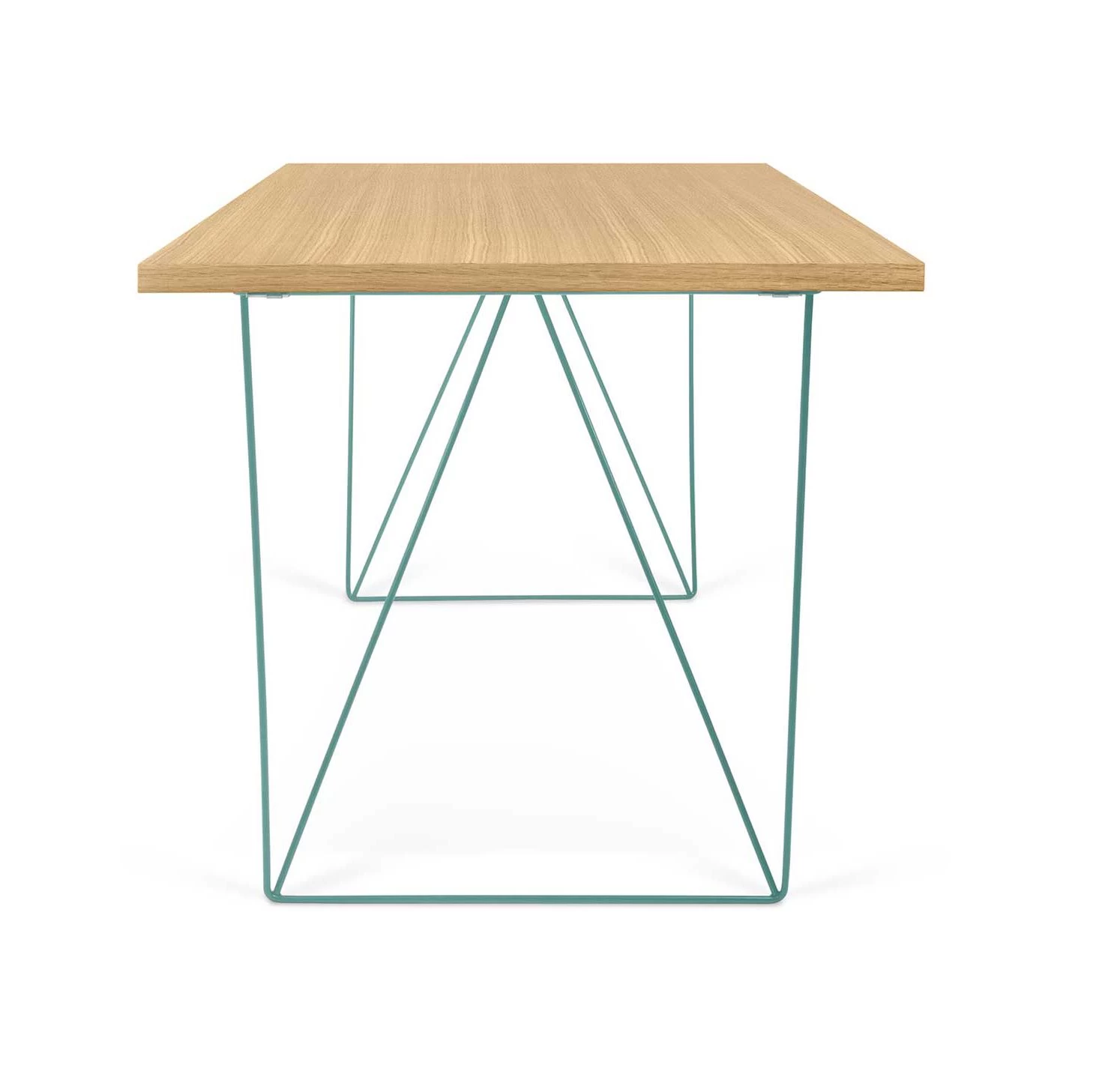 Bureau Flo uit hoogwaardige MDF, blad afgewerkt met laagje fineer van wilde eik. Groene geometrische pootjes op verschillende manieren te monteren.