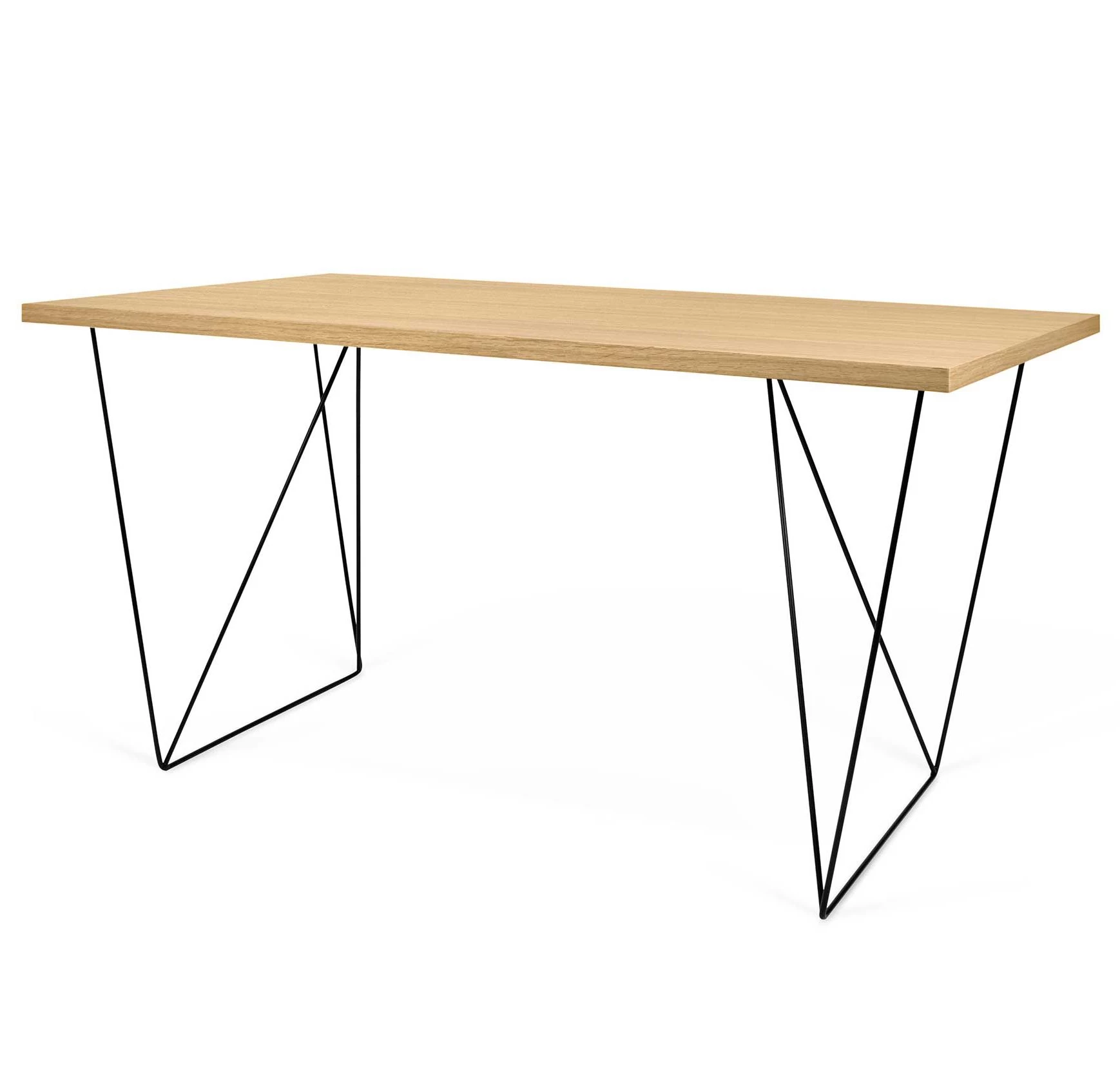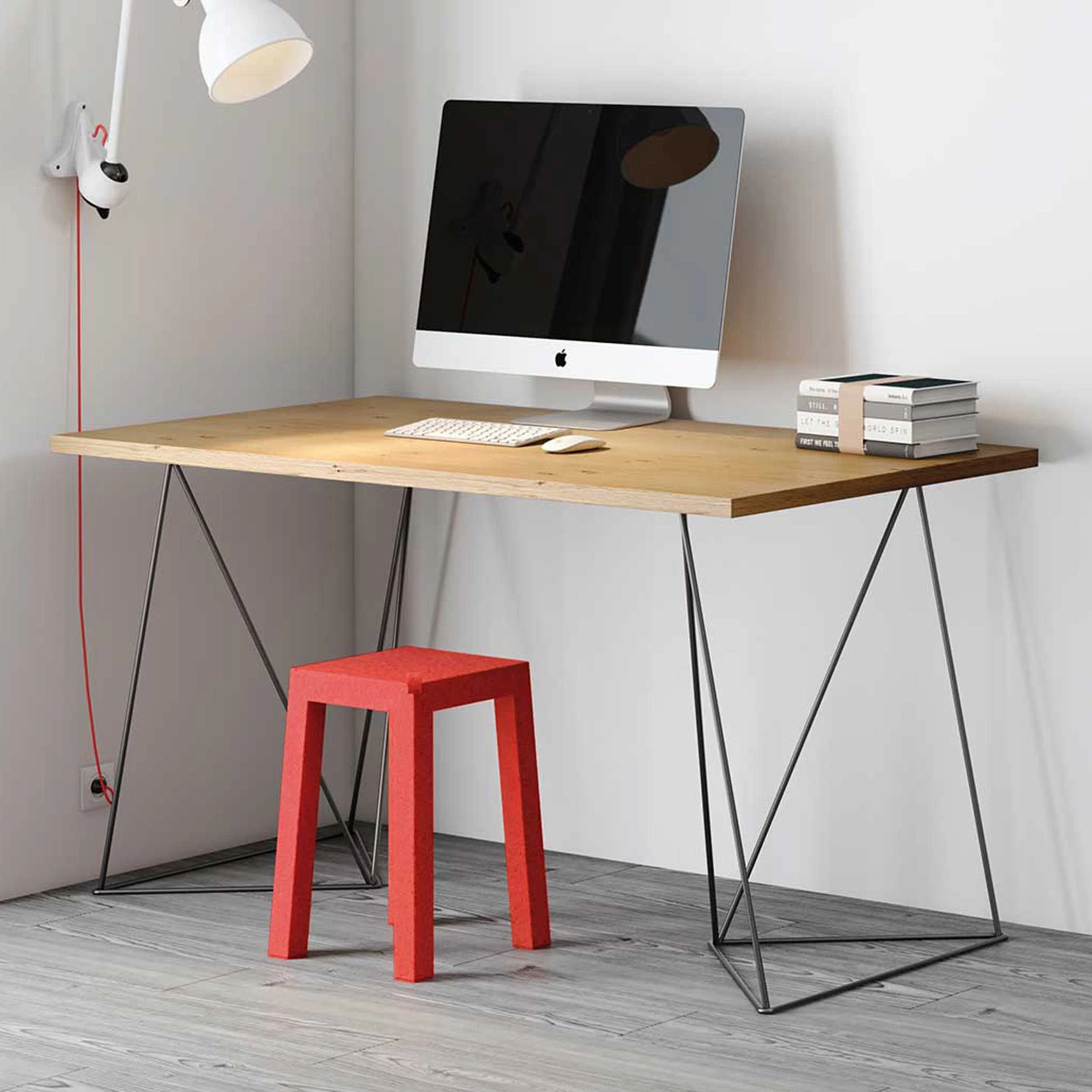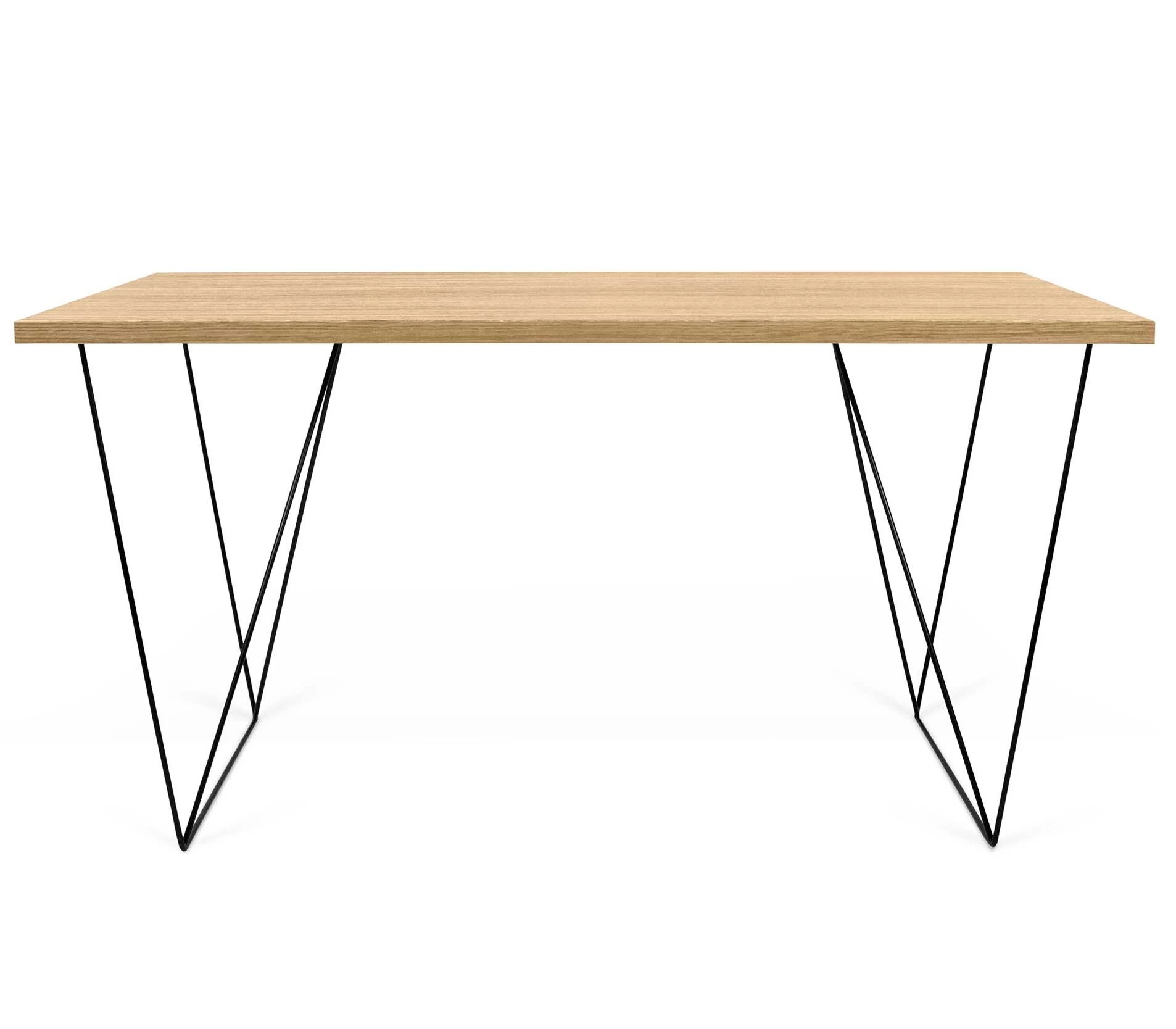 Bureau Flo uit honingraatpaneel, blad afgewerkt met laagje fineer van wilde eik. Zwarte geometrische pootjes op verschillende manieren te monteren.