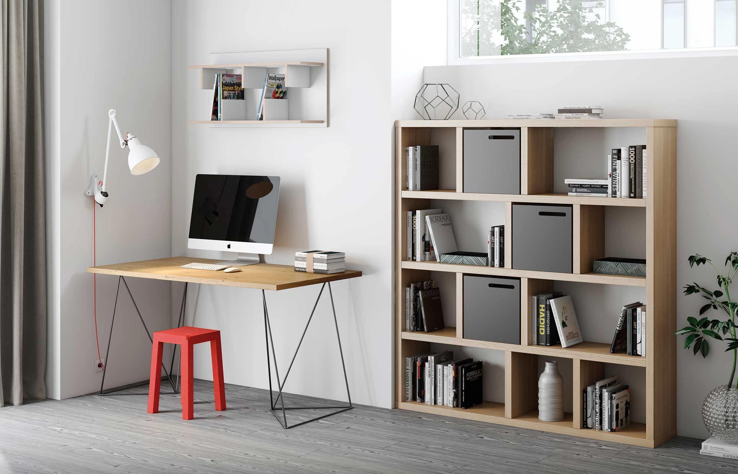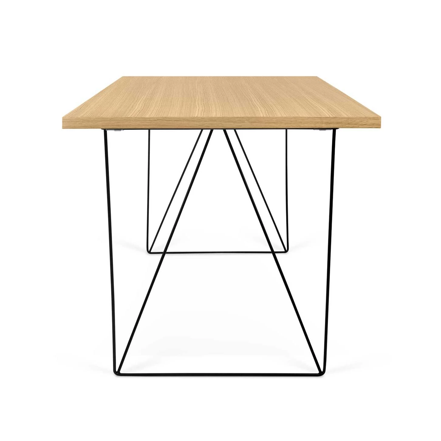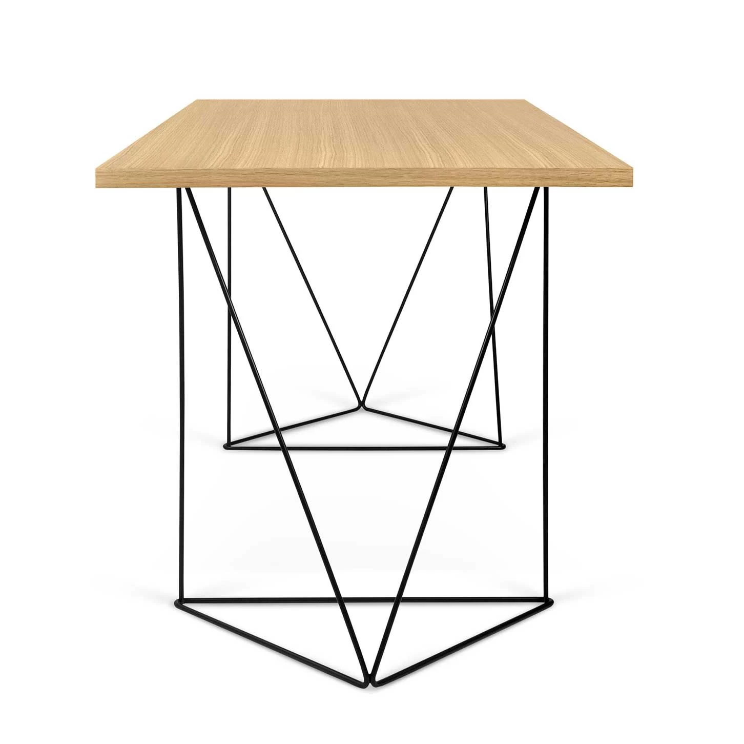 Bureau Flo uit honingraatpaneel, blad afgewerkt met laagje fineer van wilde eik. Zwarte geometrische pootjes op verschillende manieren te monteren.