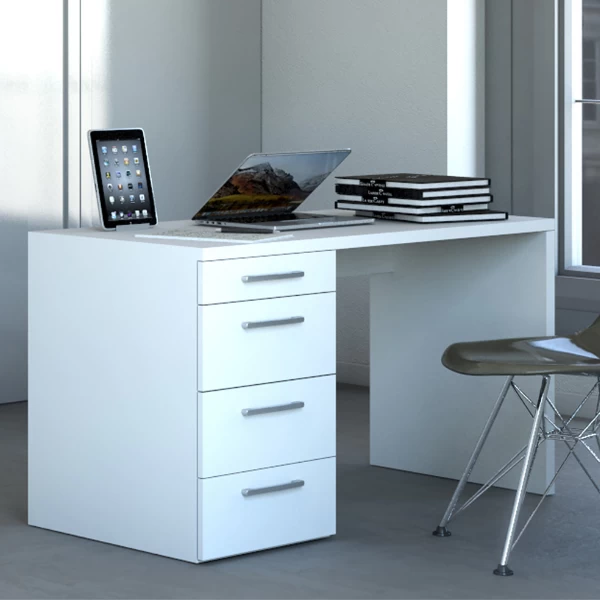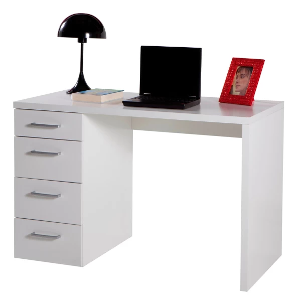 Bureau Morten 110x60x74cm uit spaanplaat met afwerking in witte melamine. Met vier opberglades.