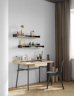 Dankzij het minimalistisch design van bureau Ply kan je ongestoord werken of studeren. Dit bureau is achteraan voorzien van een opening over de hele lengte van het bureaublad, waardoor jij gemakkelijk een boek, cursus of andere documenten rechtop kan zetten. Er is ook een lade waarin je enkele kantoorspullen kan opbergen. Het bureaublad is gemaakt van spaanplaat en MDF en is afgewerkt in eikfineer. De zwarte poten zijn gemaakt van metaal.