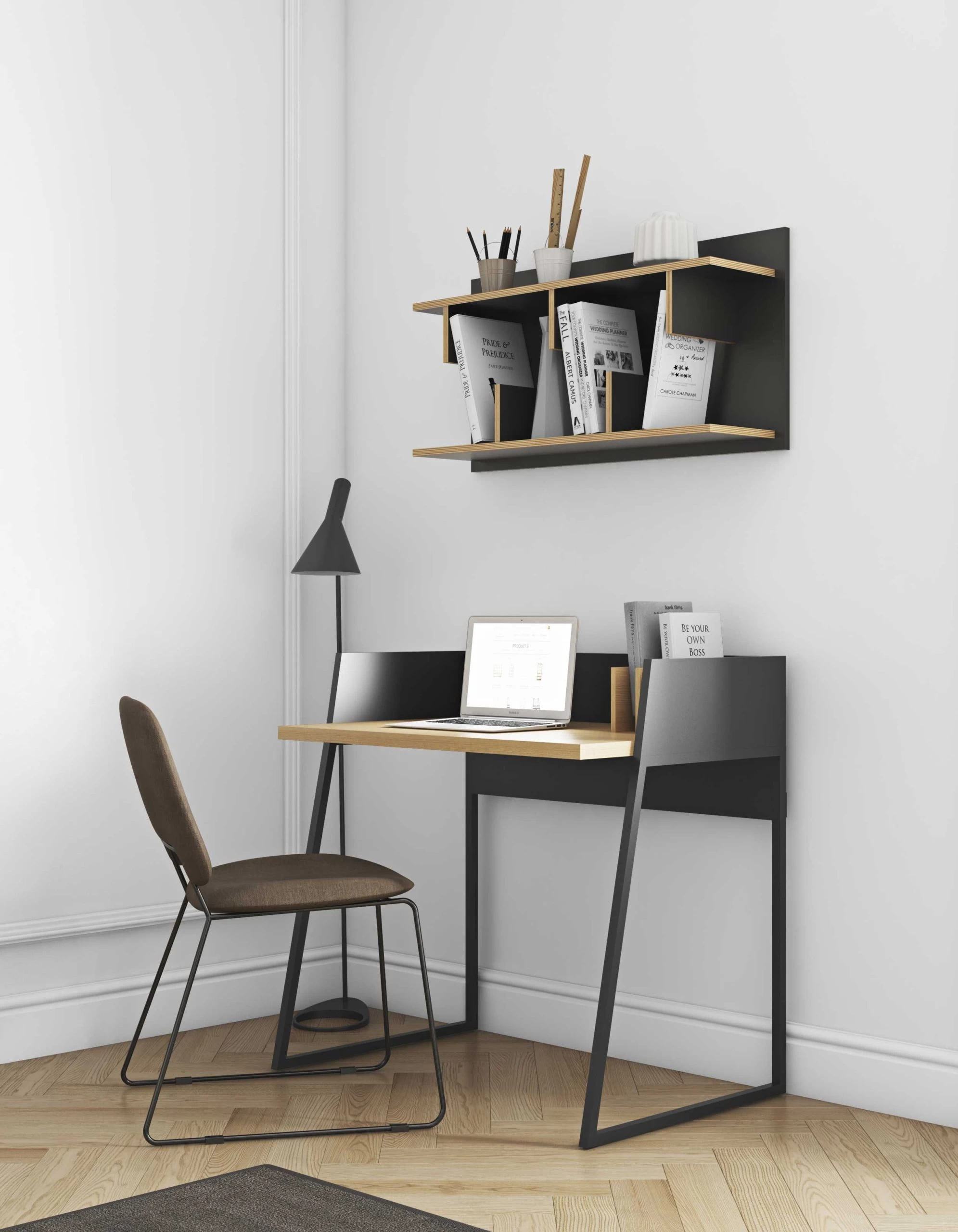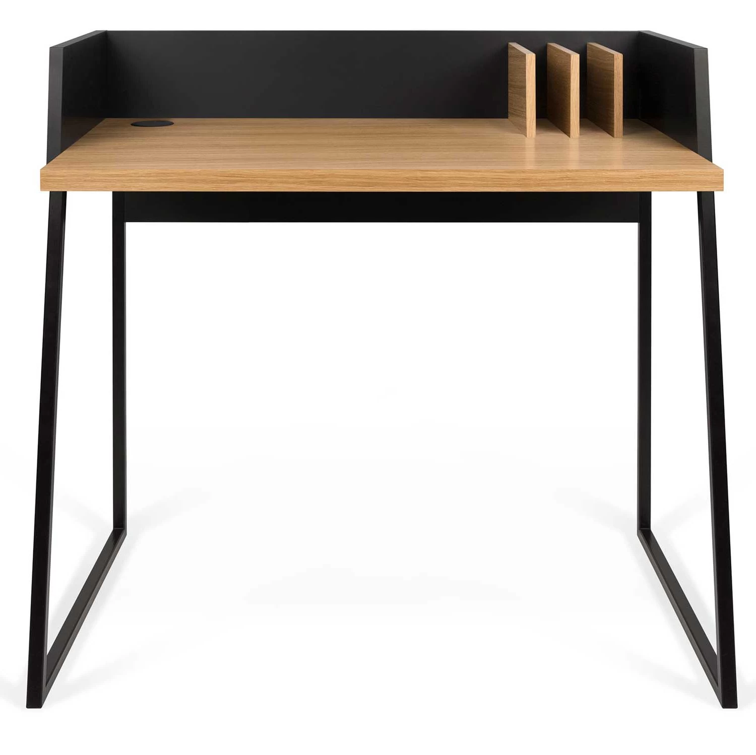 Bureau Volta uit hoogwaardige MDF, bureaublad afgewerkt met laagje eikfineer. Uitgerust met 3 boekensteunen.