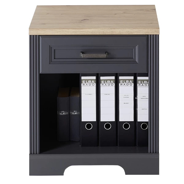 Ga voor de modern landelijke woonstijl met de meubelen van de Samine-reeks, die zijn gemaakt uit spaanplaat in grafiet en met afwerkingen in eikdecor. De reeks bestaat ook in het wit. Dit bureaukastje past perfect onder het bureau Samine. Dankzij de opberglade kan je al je kantoorbenodigdheden netjes opbergen. In het open opbergvak heb je ruimte voor dossiers en mappen. Geniet van de opbergruimte met soft-close systeem en metalen handgrepen. Ontdek de volledige collectie Samine op onze website.