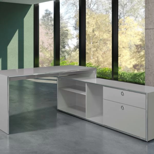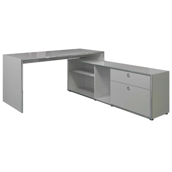 Kantoorset Infinity in lichtgrijs is een hoogwaardig en ruim bureau met een chique uitstraling. De lichtgrijze hoogglanslak en het chromen frame zorgen voor een moderne en harmonieuze uitstraling. Het wordt geleverd met een lade en klep voor opslag. Het is bovendien is FSC-gecertificeerd voor verantwoord bosbeheer.