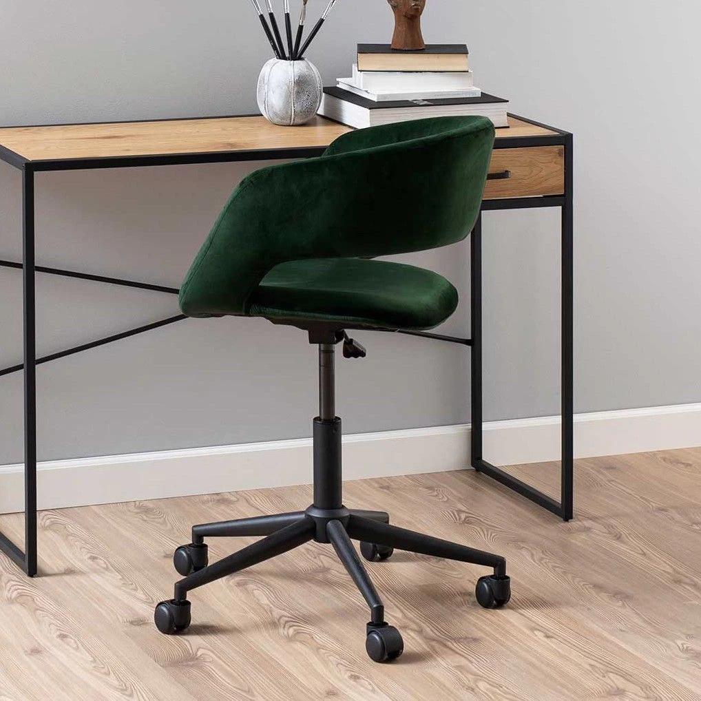 Met deze trendy bureaustoel maak je zelfs het mufste kantoor hip. De stoel valt niet alleen op door haar unieke vormgeving, maar ook door haar groene kleur. Bureaustoel Dusty is uitgerust met wieltjes en is in hoogte verstelbaar. Het onderstel is gemaakt van matzwart gepoedercoat metaal.