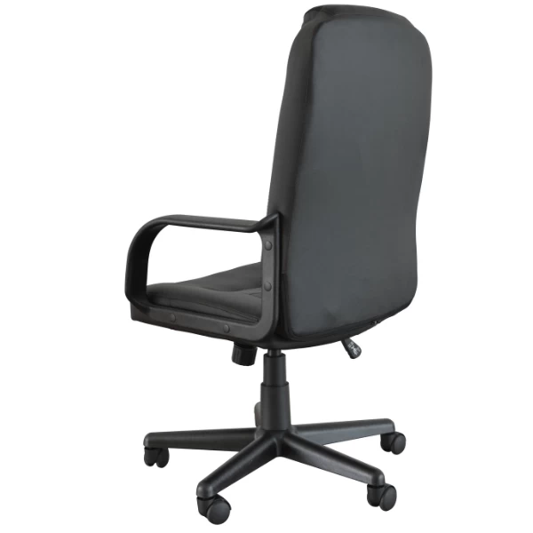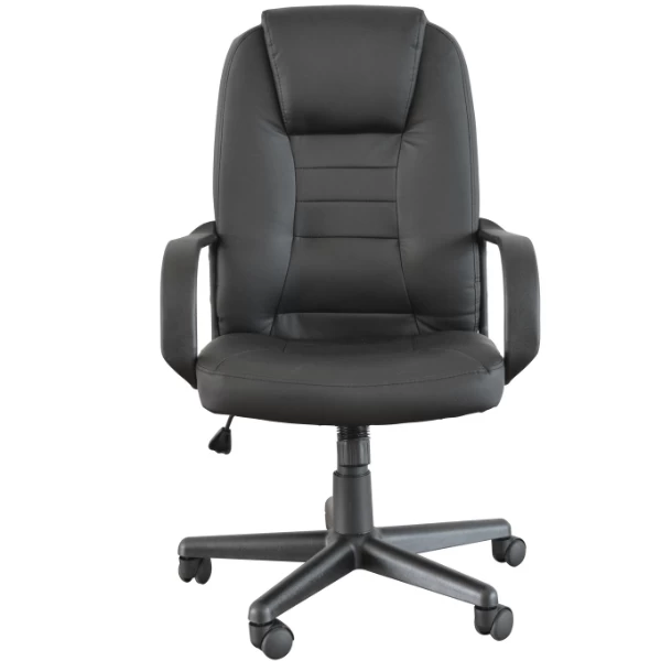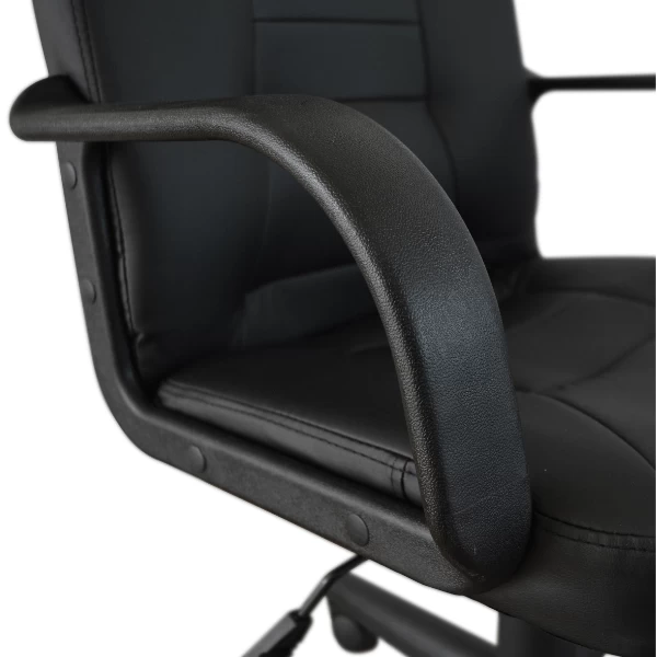 Bureaustoel Manny heeft een matzwarte bekleding in polyurethaan zonder ftalaat. De zitting en de rug zijn gevuld met schuim en het onderstel is uit nylon en heeft 5 wieltjes.Â