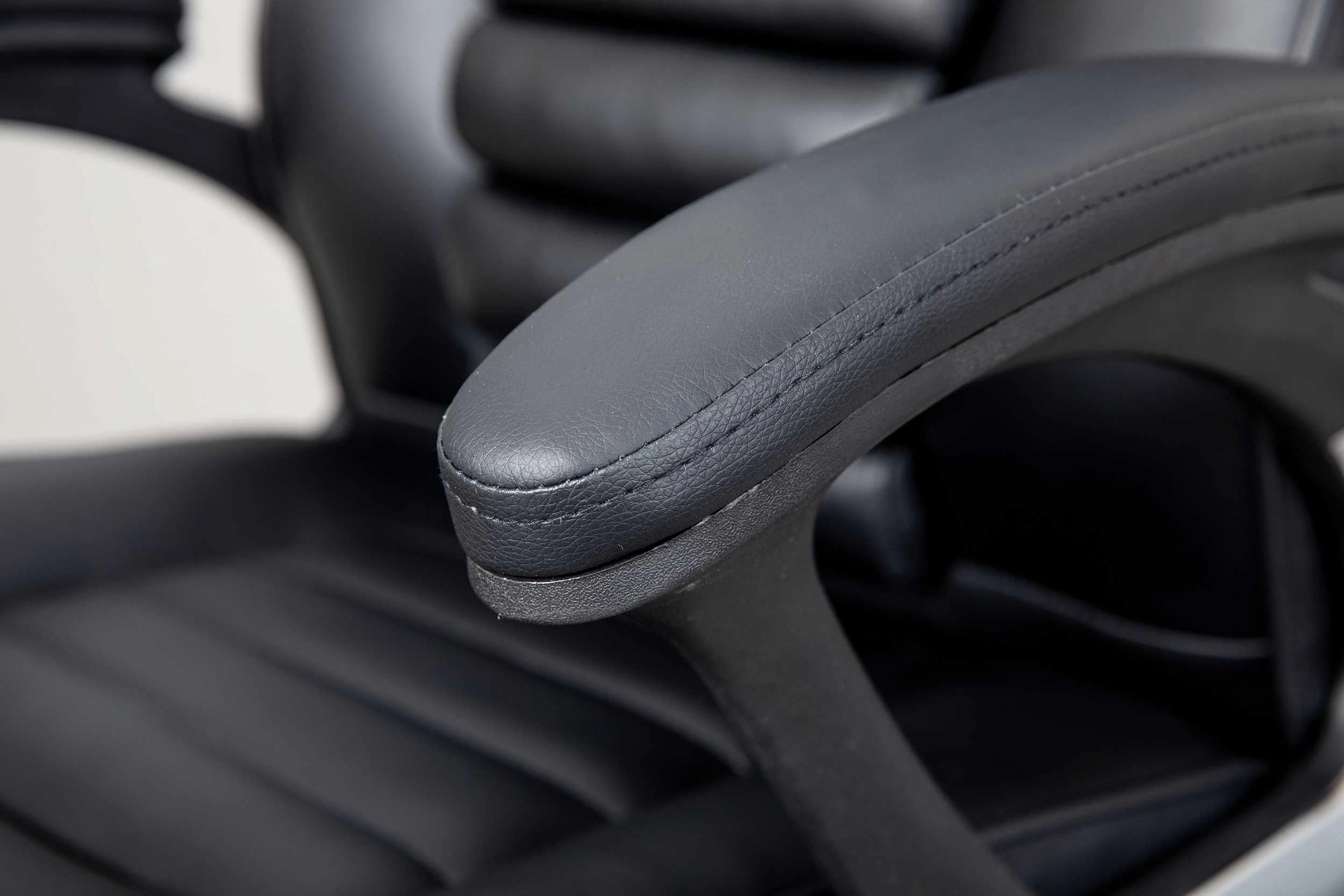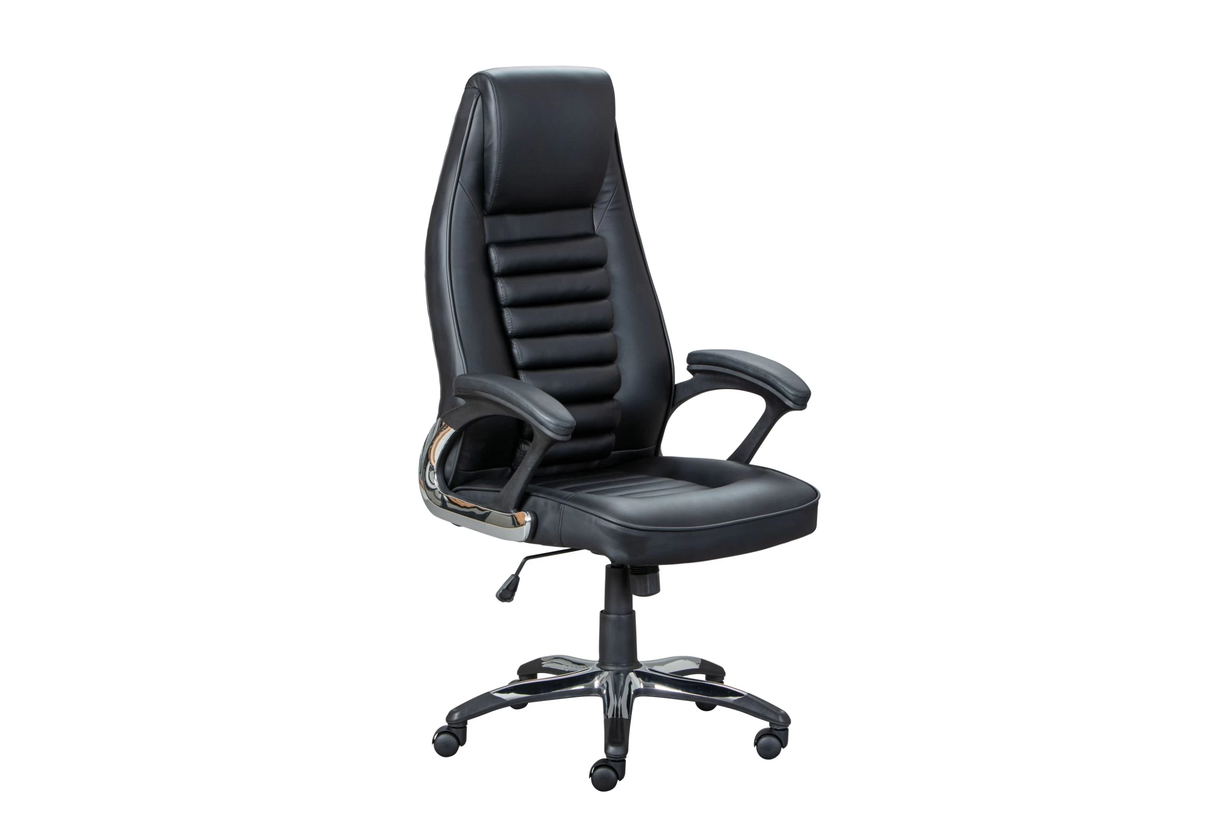 Bureaustoel Patroni, uitgerust met wieltjes en armleuningen. Bekleed met zwarte kunstleer.