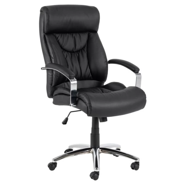 Bureaustoel Tobe met chroomkleurige metalen voet en bekleding in zwart kunstleer. Voorzien van armleuningen en wieltjes. In de hoogte verstelbaar tussen een zithoogte van 51.5 tot 60.5cm