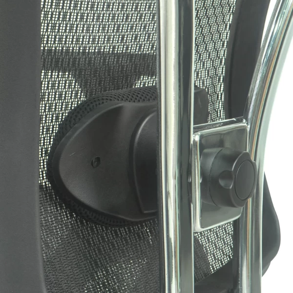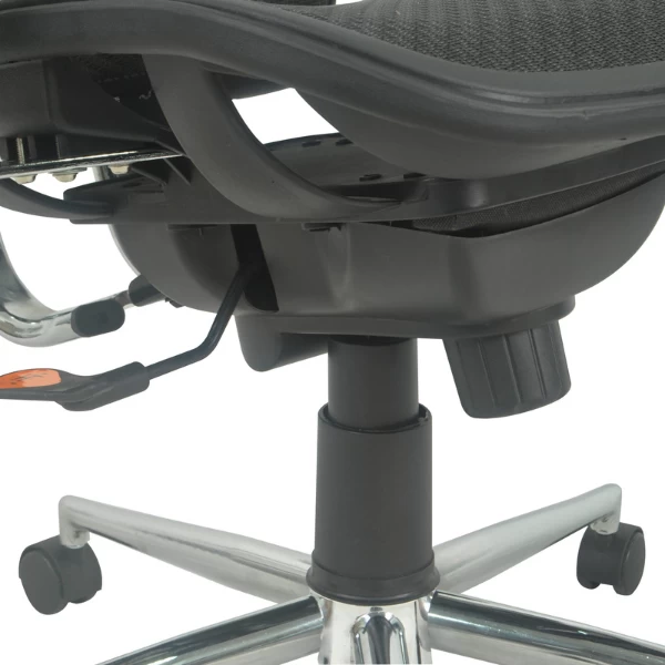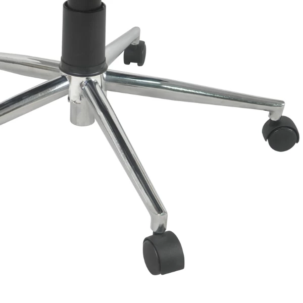 Bureaustoel Uline heeft een bekleding in mesh stof, de zitting is voorzien van een dikke vulling. Het onderstel is uit verchroomd metaal en de wielen zijn uit nylon.