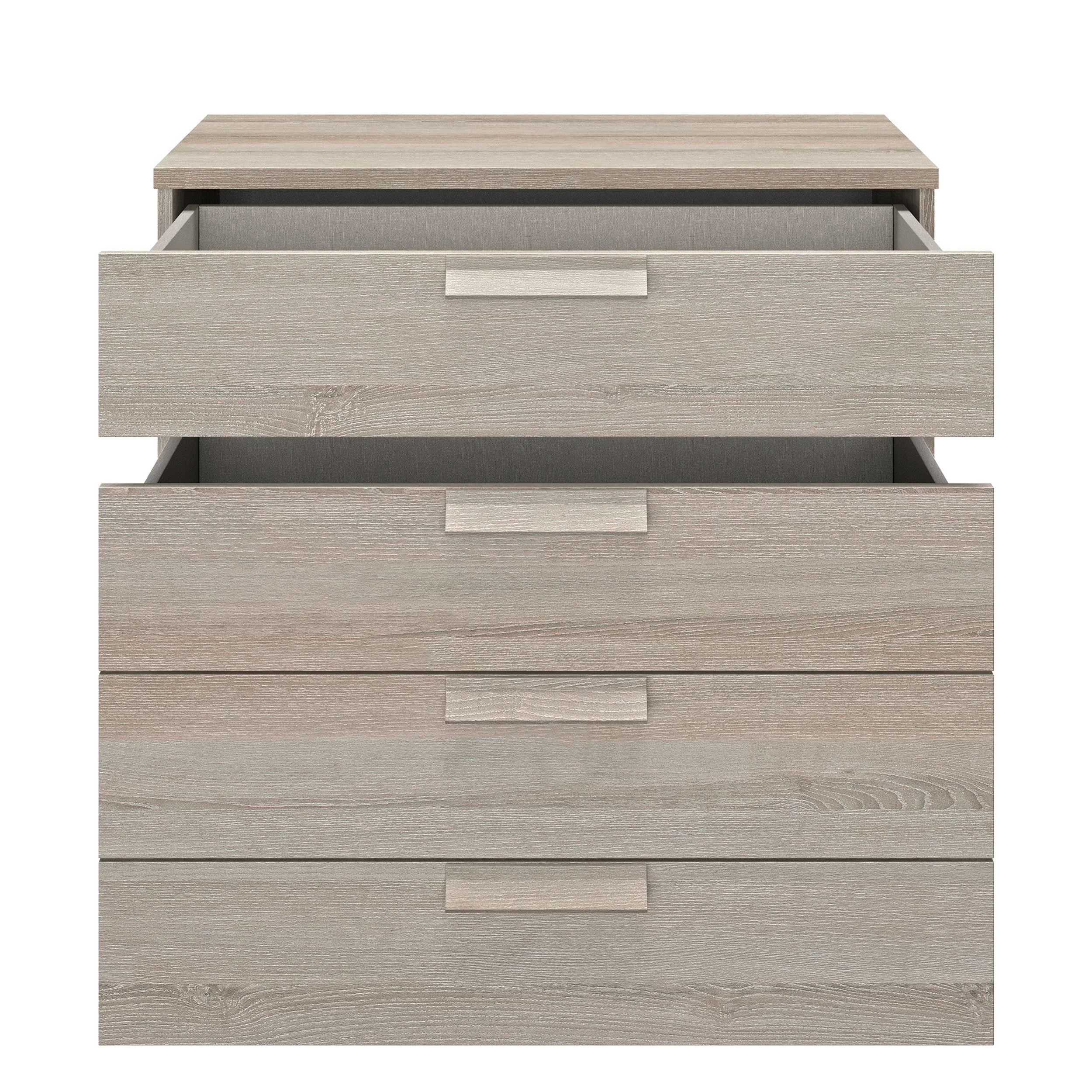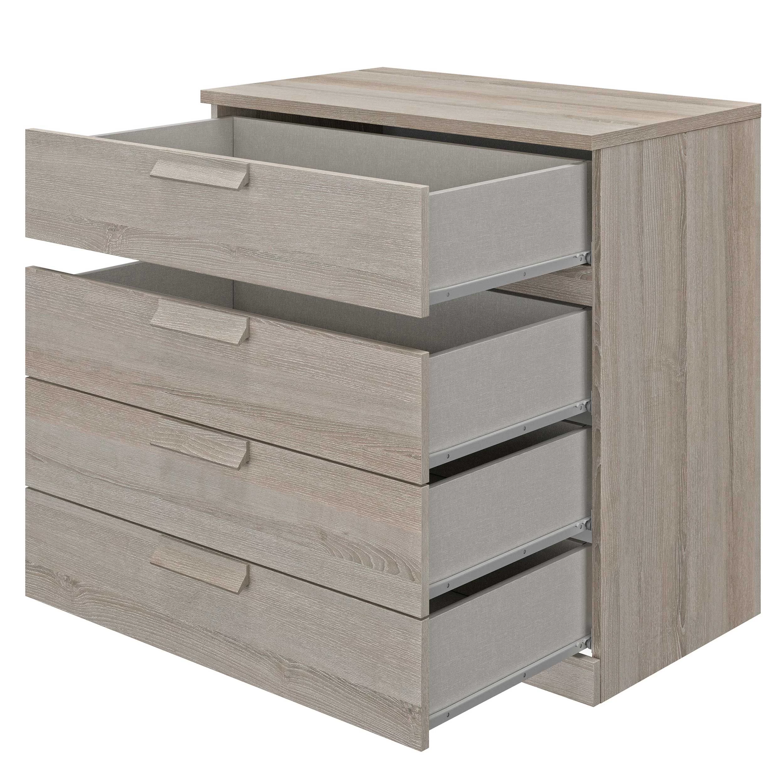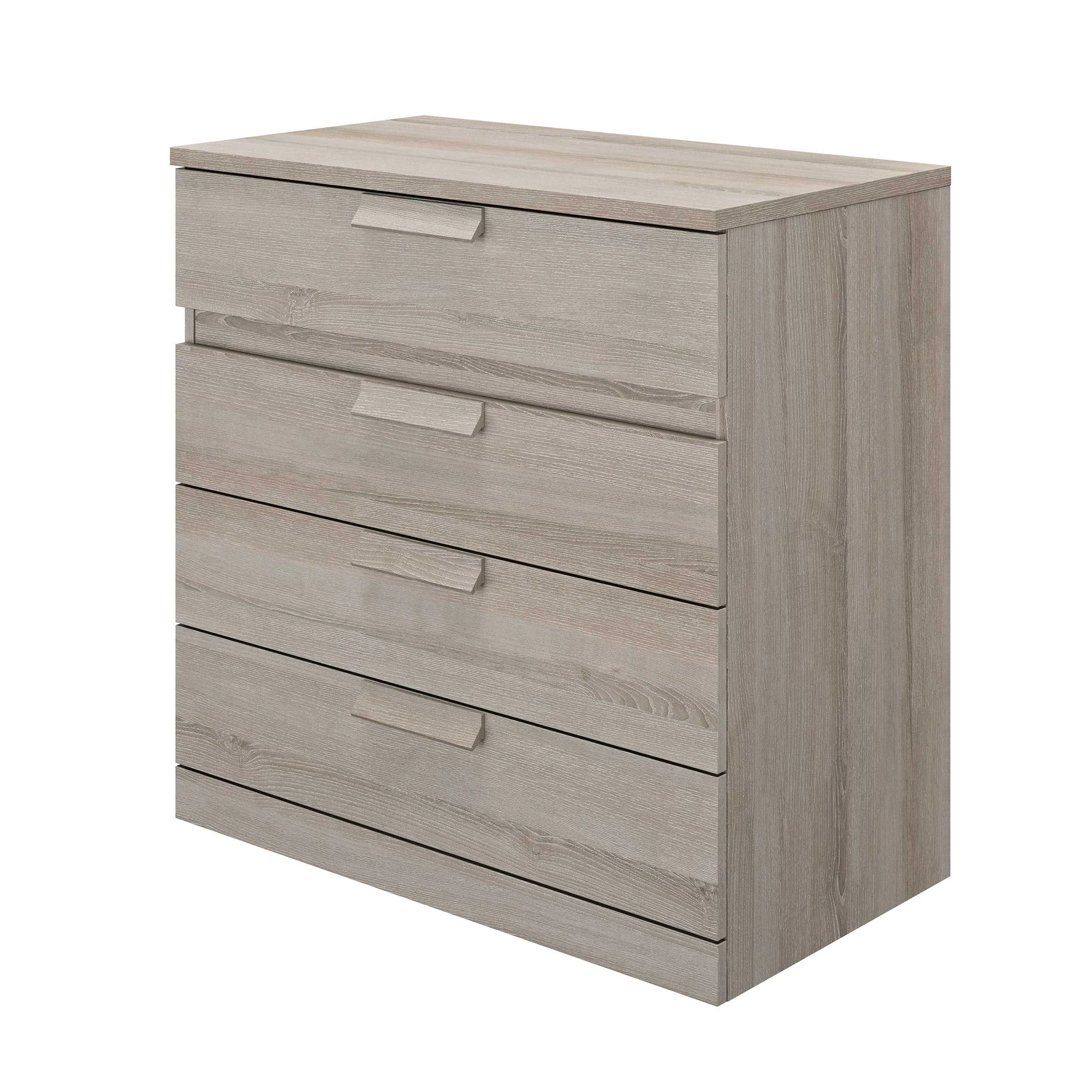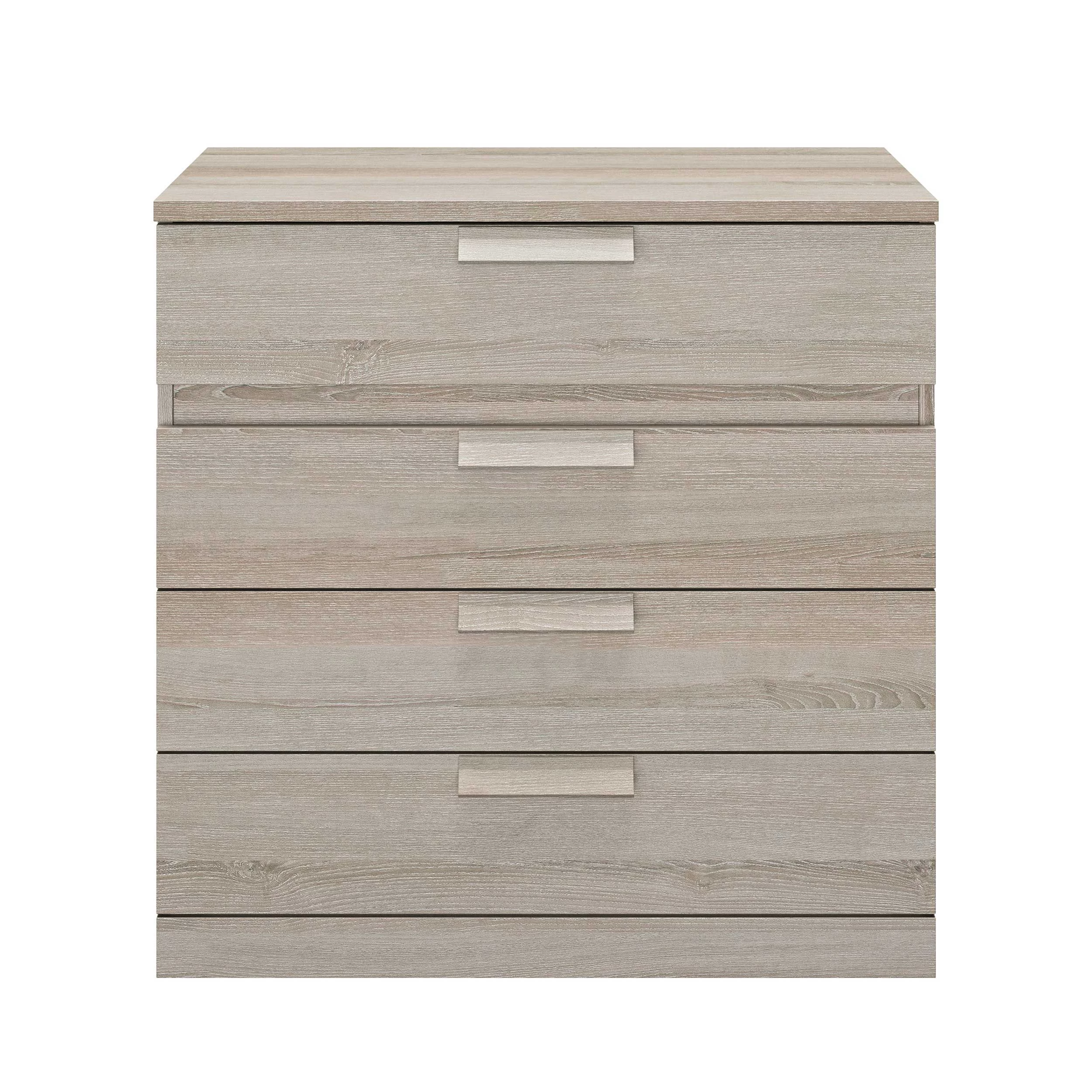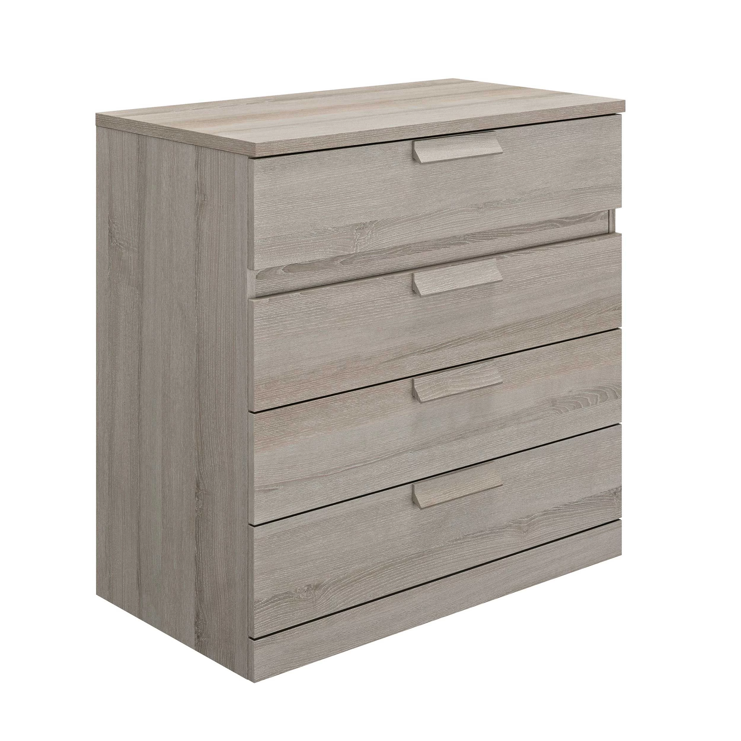 Deze hoge commode is uitgerust met 4 lades waarin je heel wat spullen een plaatsje kunt geven. De commode is afgewerkt in lichtgrijze eik.