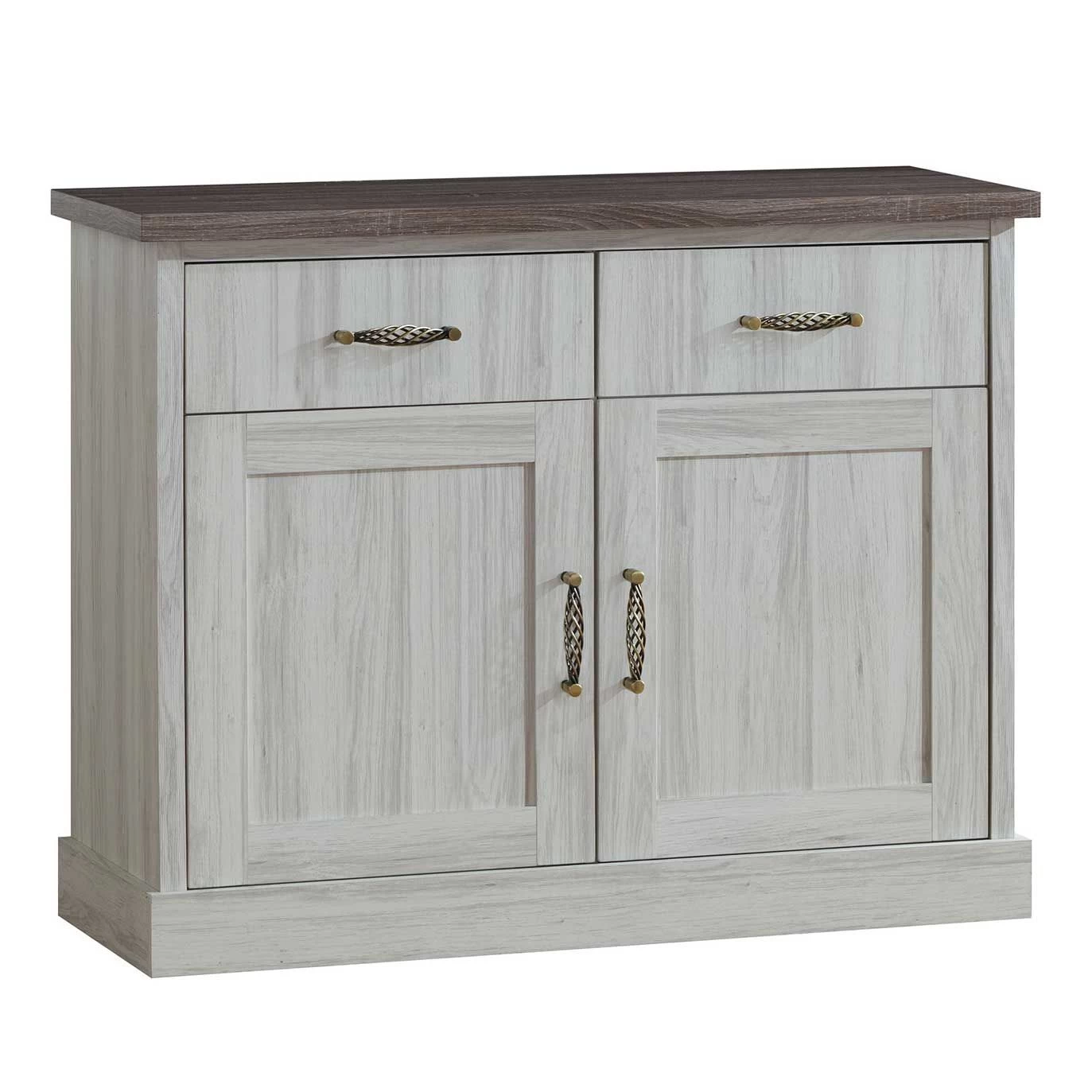 Waar berg jij al je beddengoed, ondergoed en sokken op? Deze landelijke Emily commode is gemaakt uit spaanplaat met een lichtgrijs eikdecor. De kast heeft een prachtig donker blad en elegante handvaten. Deze commode telt twee laden en twee deuren met acher elke deur telkens een legplank.