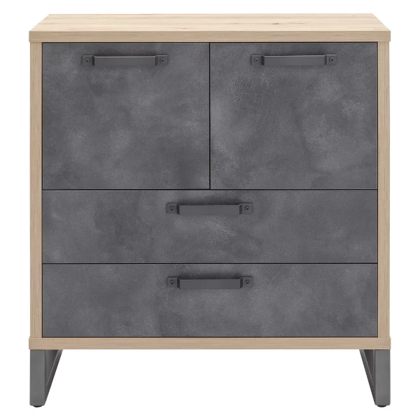 Commode 92x45x98cm uit spaanplaat met afwerking in eikdecor en betonlook. Met twee deuren en twee lades.
