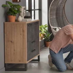 Fan van de industriële woonstijl? Dan is de reeks Faber helemaal jouw ding! Deze commode is gemaakt uit gerecycleerde spaanplaat, afgewerkt met melamine. Het warme eikdecor gaat mooi samen met de donkere betonlook voor een stoere uitstraling. Achter de twee deuren heb je plaats om bijvoorbeeld kleren of boeken netjes op te bergen. In de twee opberglades heb je ook ruimte voor ondergoed, sokken, of andere kleine spullen. De collectie Faber bevat meubels voor elke ruimte in je huis. Ontdek de volledige collectie op onze website.