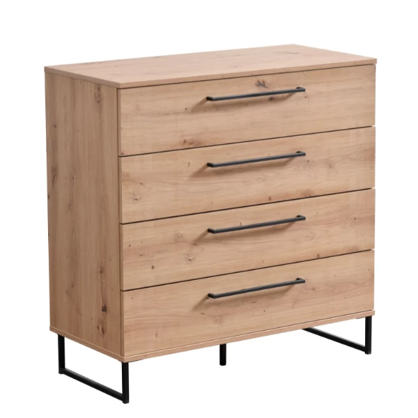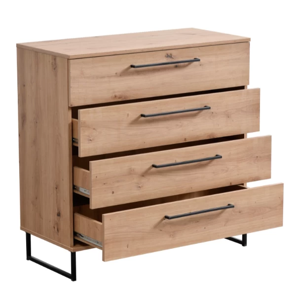 Ladekast Hoggas is een stijlvolle interieuroplossing die in elke kamer past. Het bevat praktische afmetingen van 91 x 42 x 95 cm. Het meubelstuk is vervaardigd uit spaanplaat en bevat 4 lades. De afwerking bestaat uit eikdecor met metalen handgrepen.