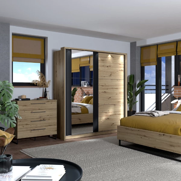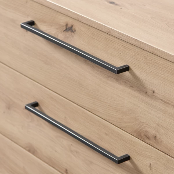 De Hoggas-meubelen stralen een warme, gezellige maar tegelijk moderne sfeer uit. Het eikdecor wordt gecombineerd met robuuste zwarte handgrepen. De kast is uitgerust met vier lades, waarin u voldoende ruimte hebt om allerlei zaken netjes op te bergen zoals bedlinnen, ondergoed of sokken. Zo geniet je ’s nachts van een opgeruimde slaapkamer. Let ook op de leuke poten die bijdragen tot de unieke look van deze kast. Ontdek ook de rest van deze collectie in onze webshop.