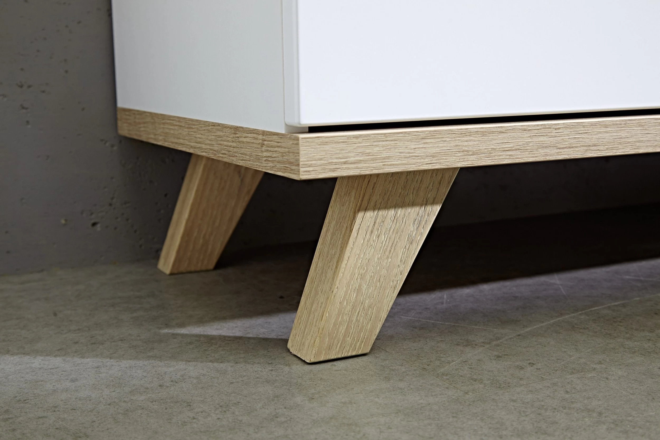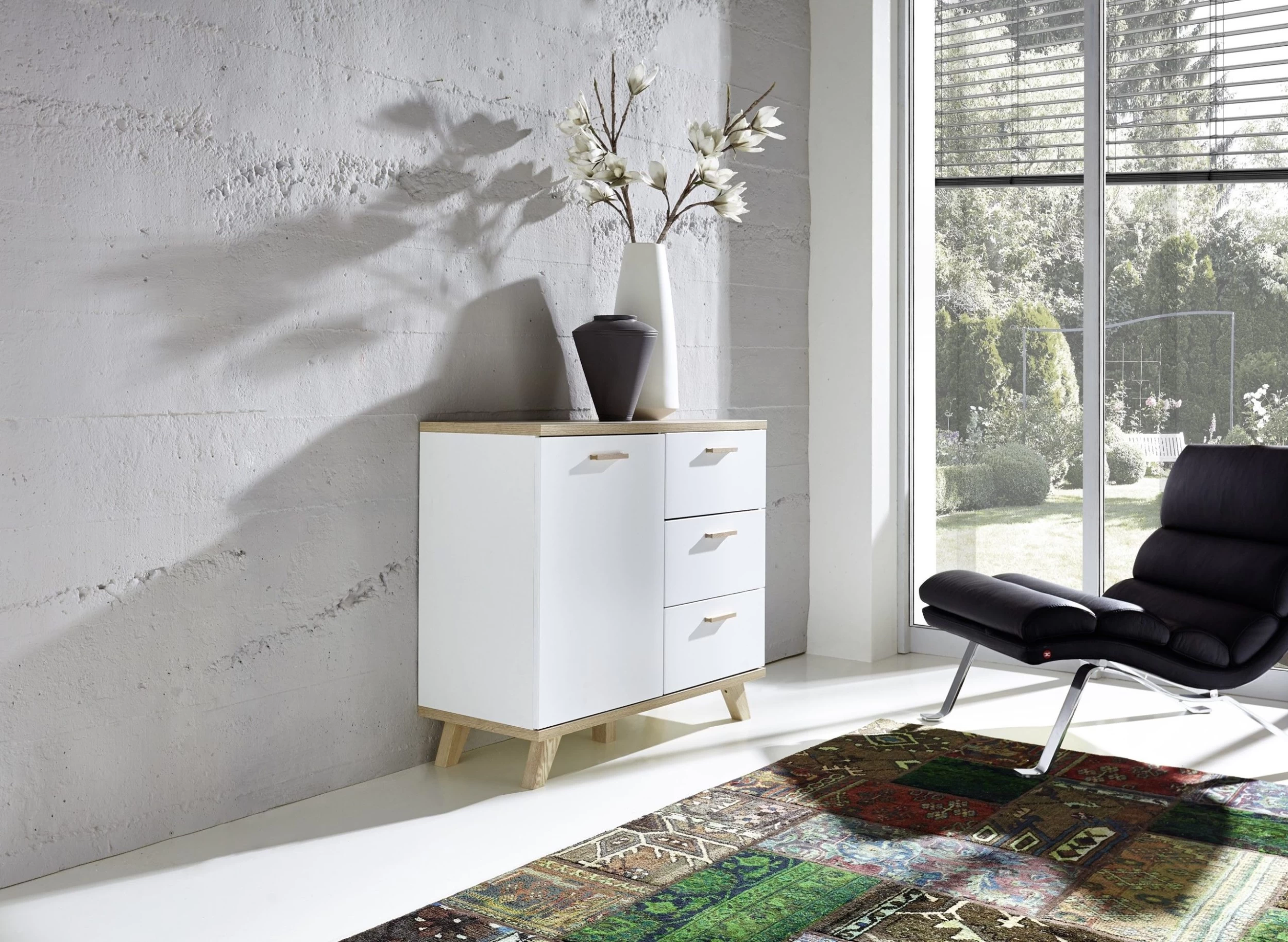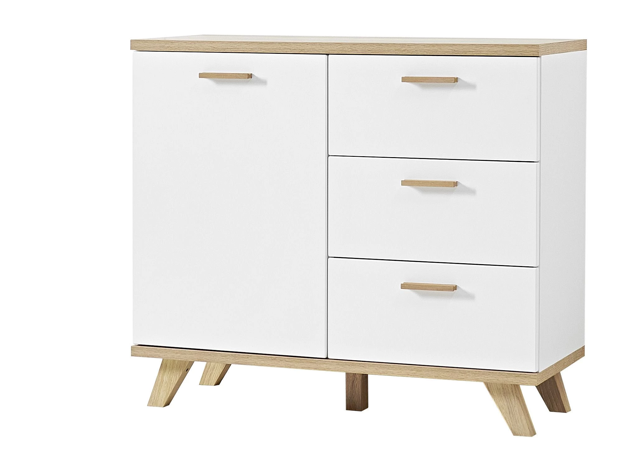 De witte Ousmane-reeks uit gelamineerde spaanplaat met accenten in eikdecor van Germania trekt alle aandacht naar zich toe. De natuurlijke uitstraling van de meubels in een modern-Scandinavische stijl is onmiskenbaar. Deze functionele commode kan dienst doen als eyecatcher in zowel woon- als slaapkamer. De combinatie van de karakteristieke massief houten poten en handgrepen met de matte, thermogevormde MDF-fronten is een schot in de roos. Het meubel is opgebouwd uit drie zelfsluitende lades en één deur met soft-close. De legplank achter de deur zorgt voor extra opbergruimte.