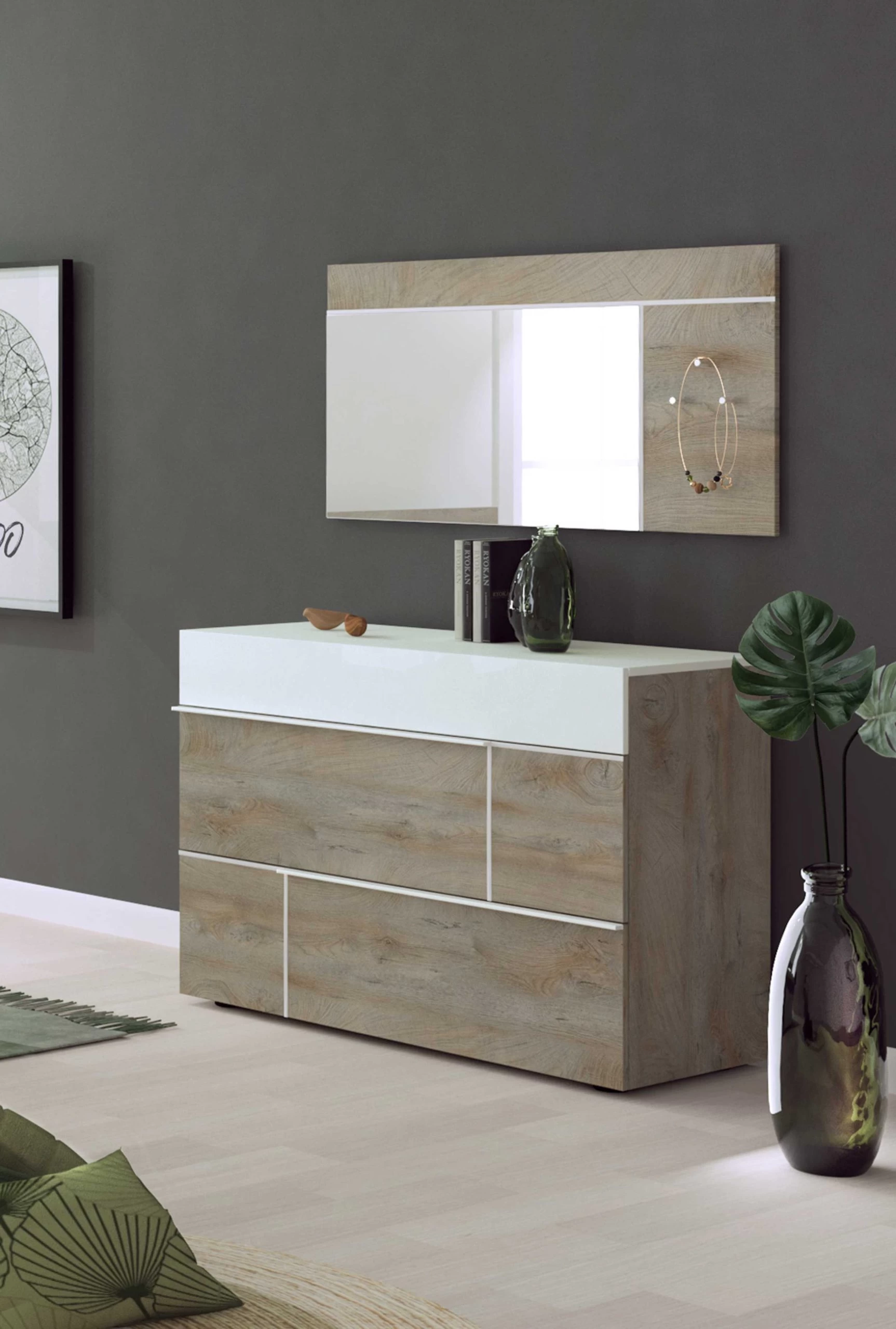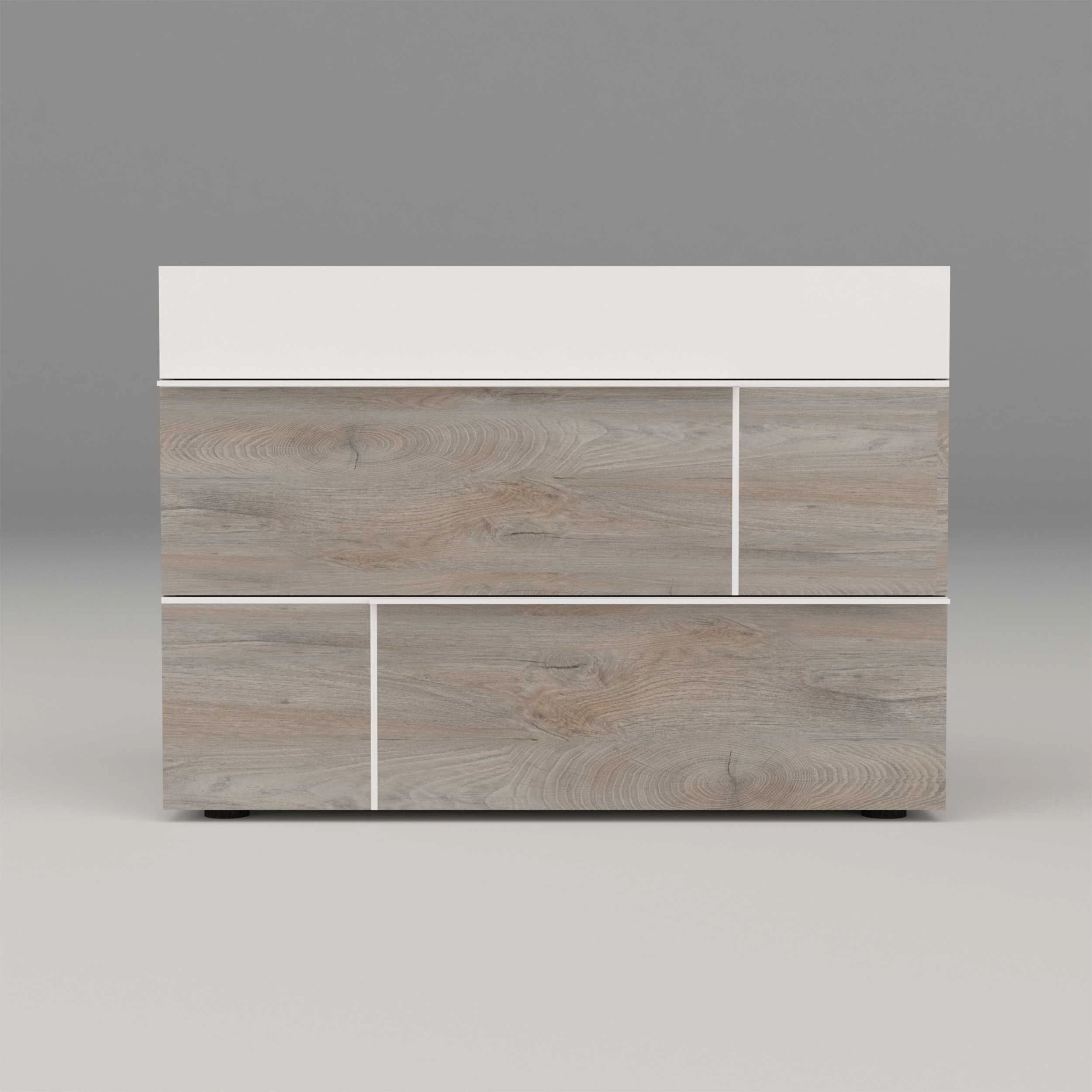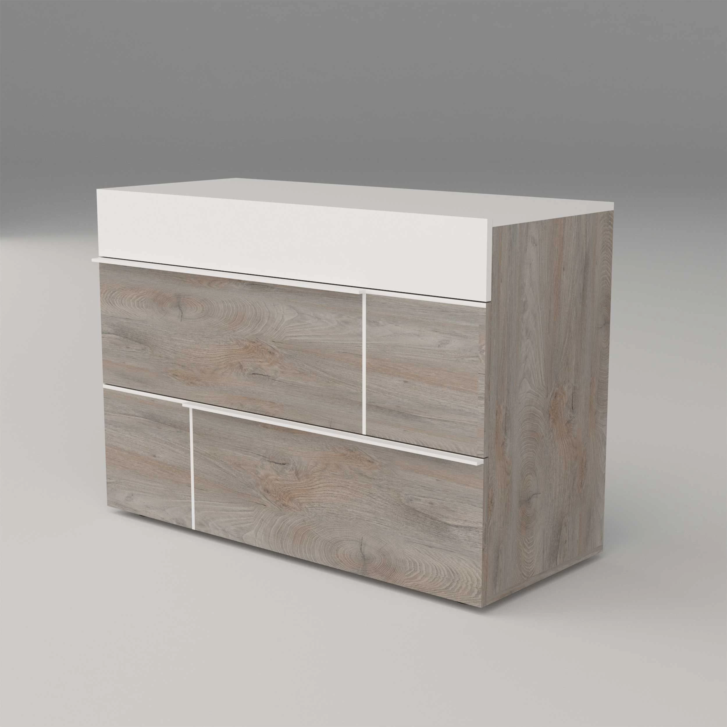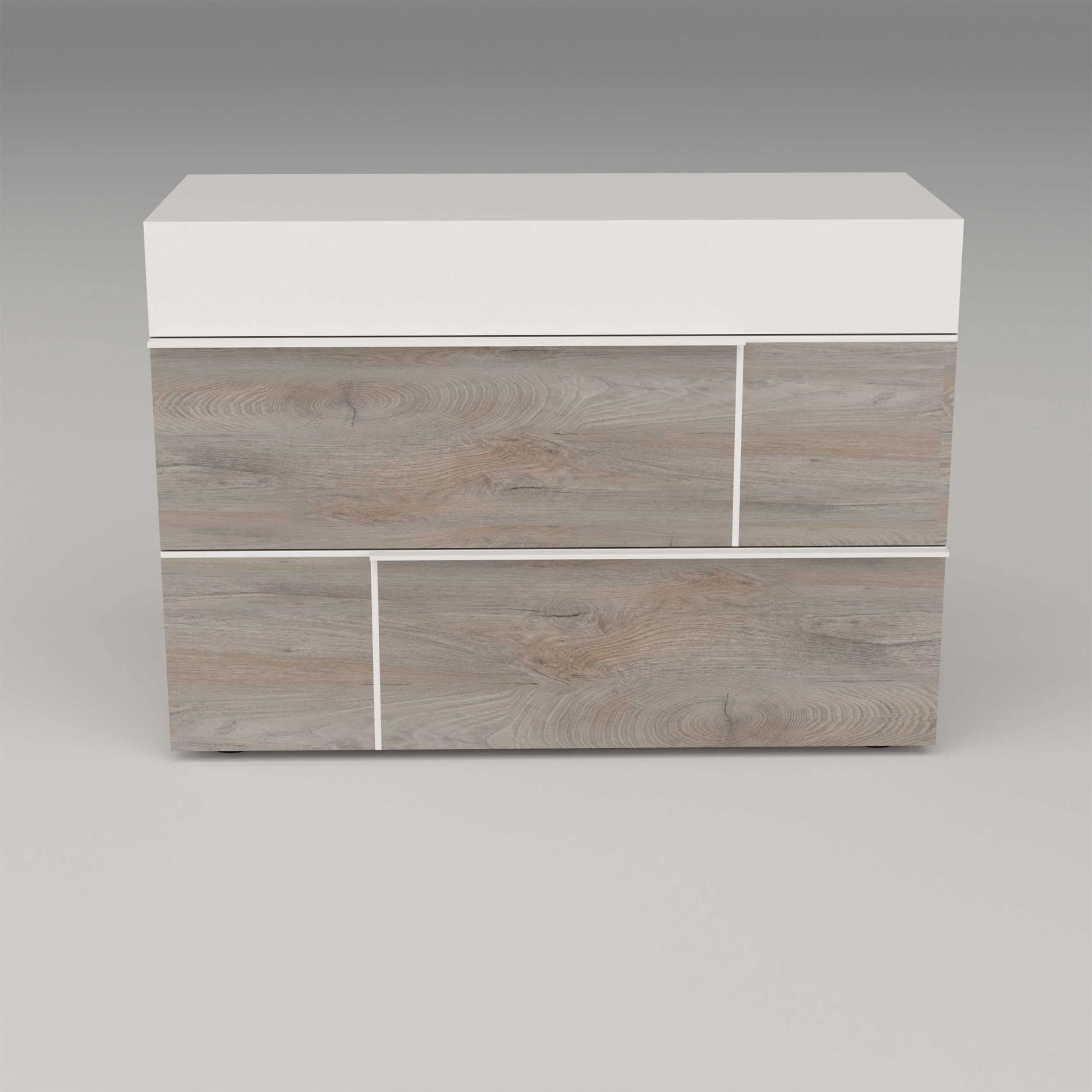 Creëer een moderne omgeving dankzij de meubelen van de Paxton-collectie. Deze meubelen zijn gemaakt uit spaanplaat met een gelakte afwerking in hoogglans wit en grijze eikdecor. De lichte kleuren bezorgen een rustige sfeer in de kamer.