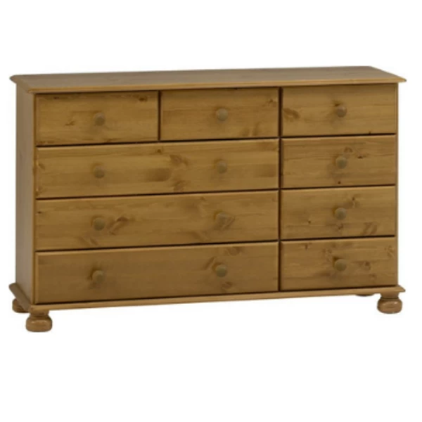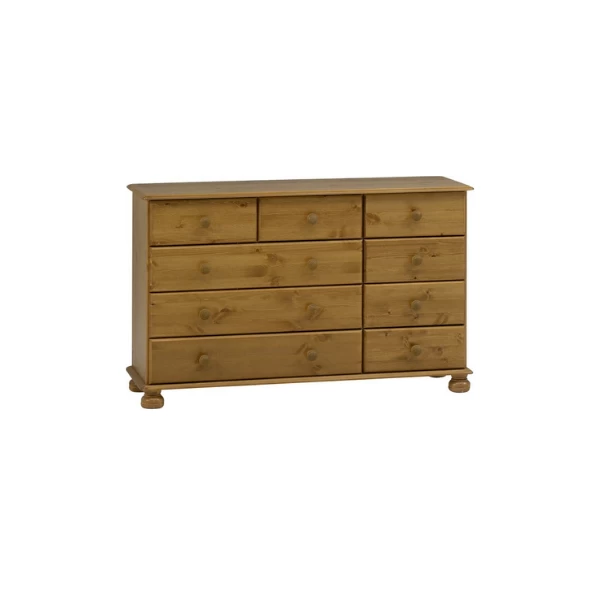 Commode Ramund, uitgerust met zes kleine lades en drie grote lades, die elk voorzien zijn van een ronde handgreep. De kast rust op vier uiterst stevige, ronde poten.