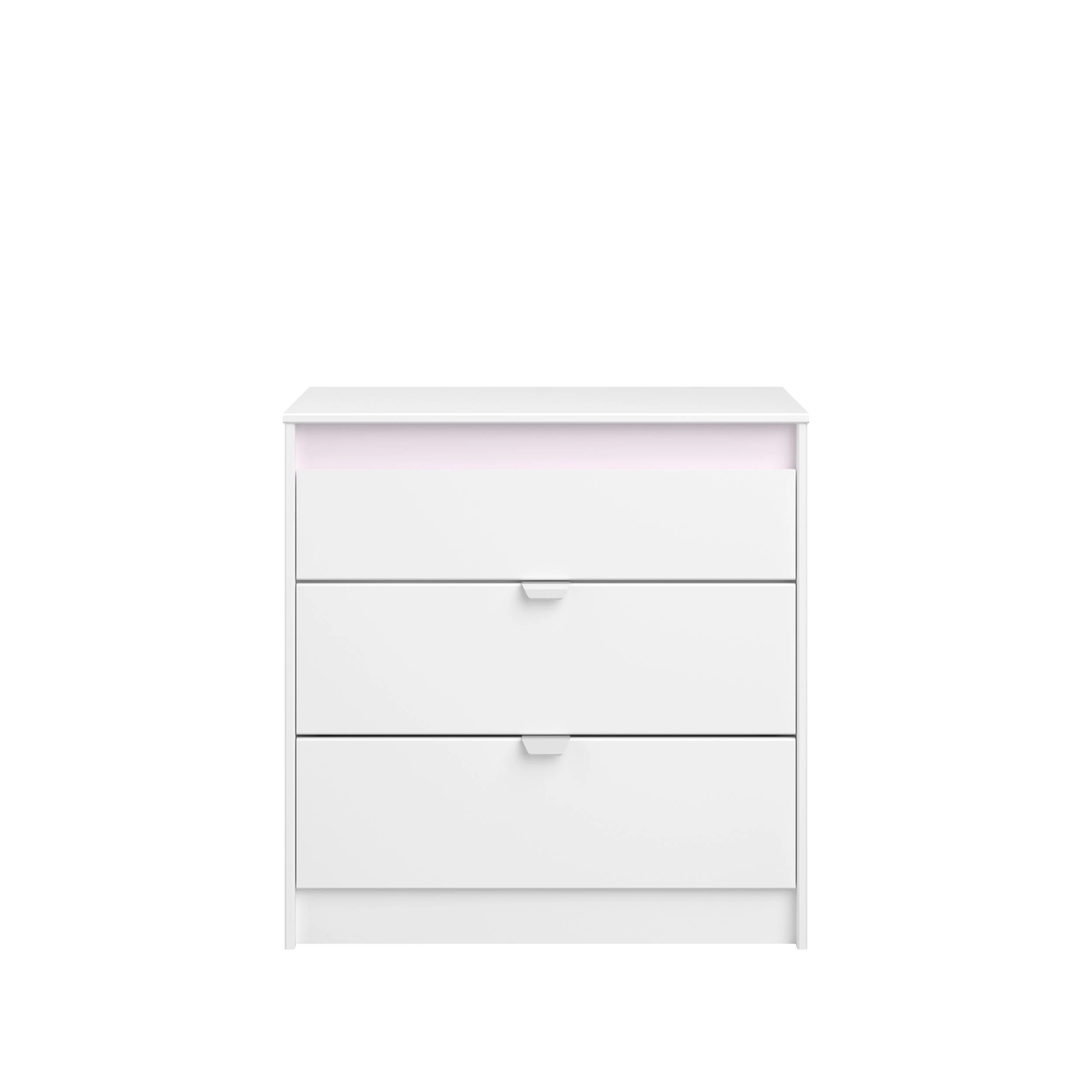 Commode Rue met 3 lades. Gemaakt uit witte spaanplaat met keuze tussen een grijs of roze accent.