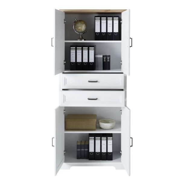 Dossierkast Samine 86x38x204cm met vier deuren en twee lades. Gemaakt uit spaanplaat in wit en eikdecor met metalen handgrepen.Â