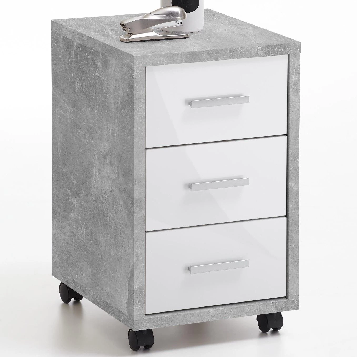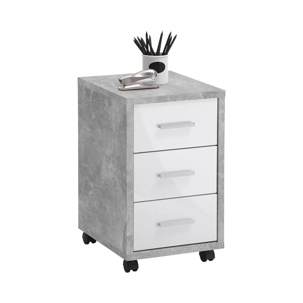 Het ladeblok Diego is een handige aanvulling voor jouw bureau. In de drie lades kan je schriften, mappen, boeken en andere kantoorartikelen netjes opbergen. Bovendien verplaats je het ladeblok makkelijk dankzij de wieltjes. Het meubel is vervaardigd uit spaanplaat met betonlook, de lades hebben een wit glanzende façade.