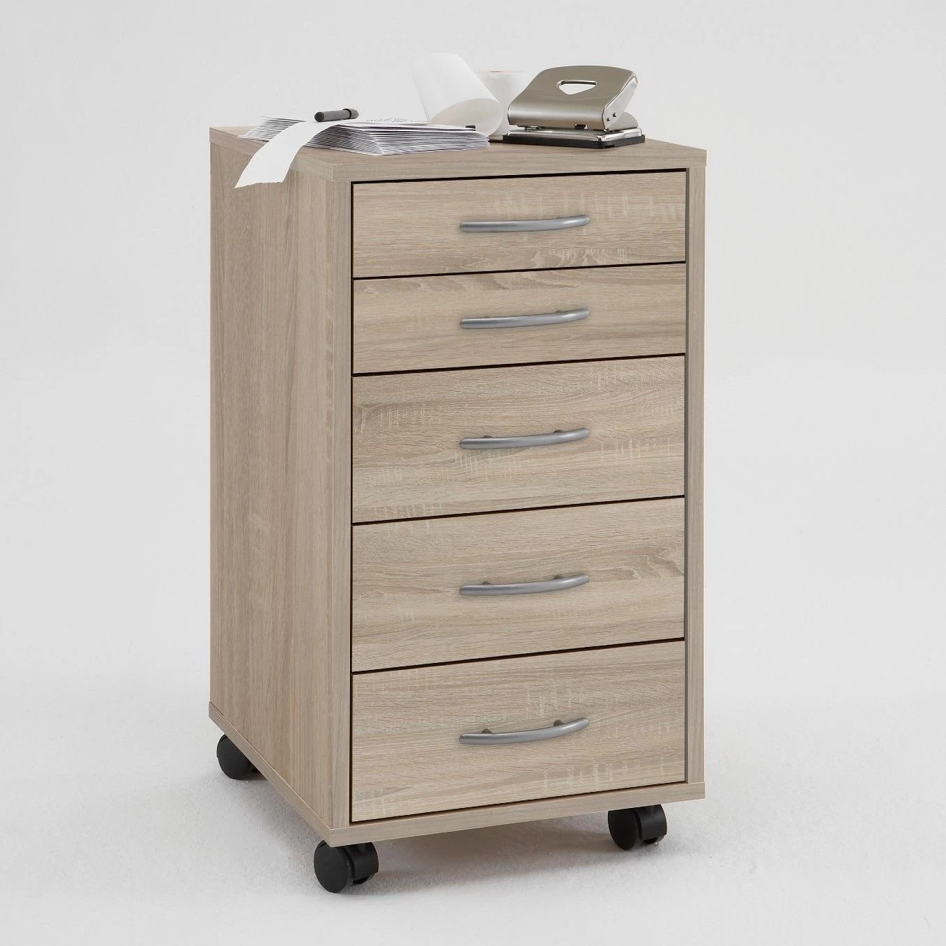 De Till rolcontainer is uitgerust met twee kleine en drie grote laden en heeft handige wieltjes. Het moderne kastje is vervaardigd in spaanplaat met een eikdecor.