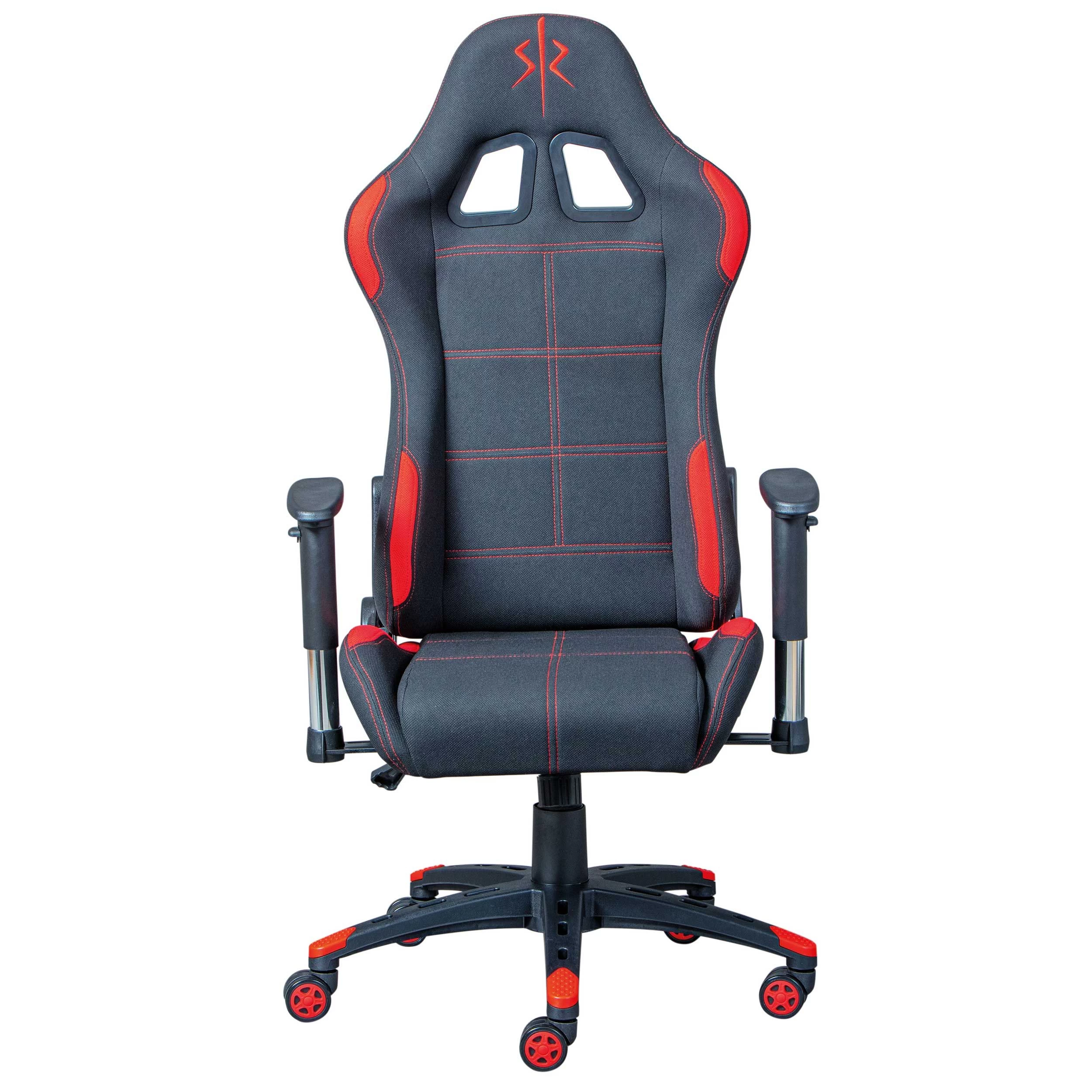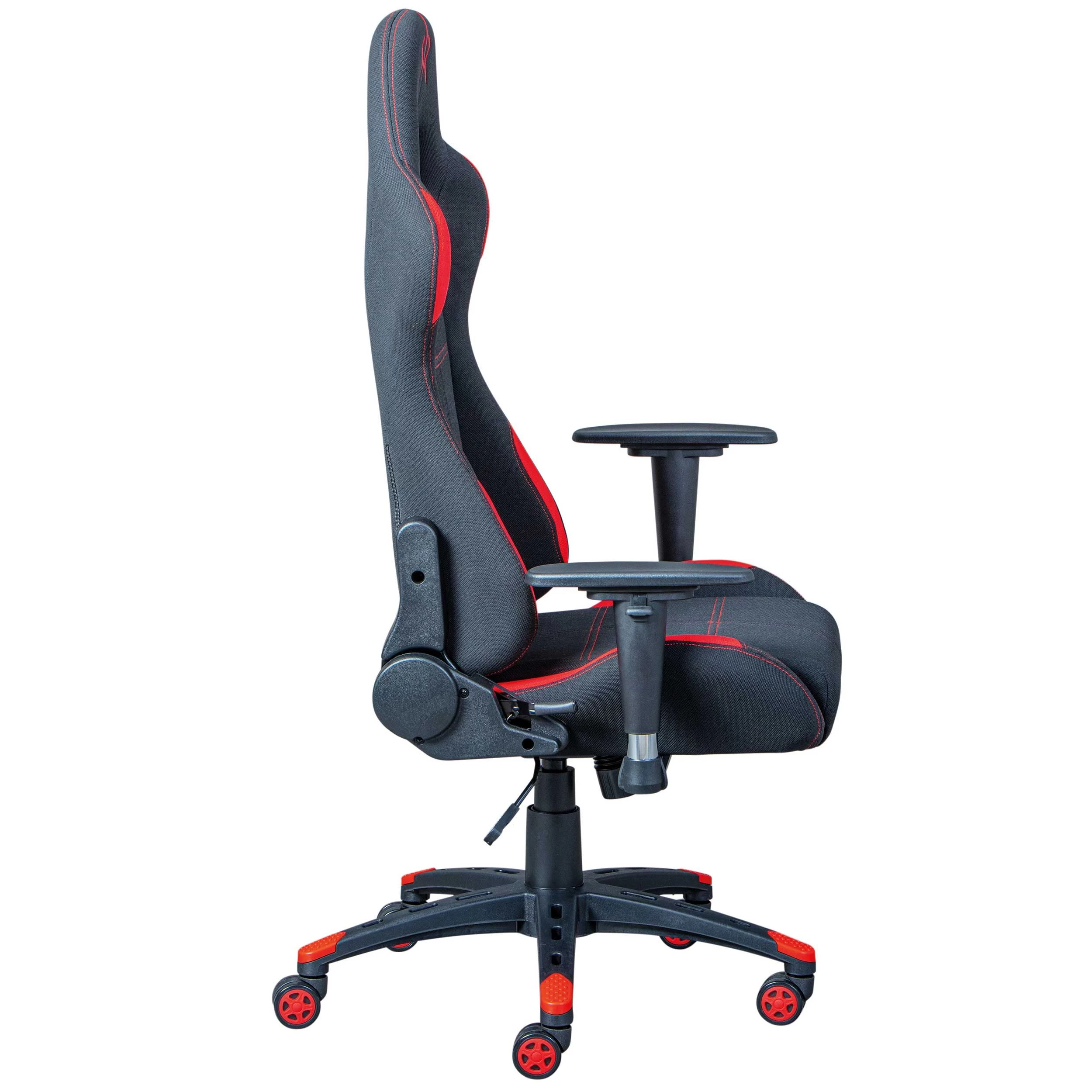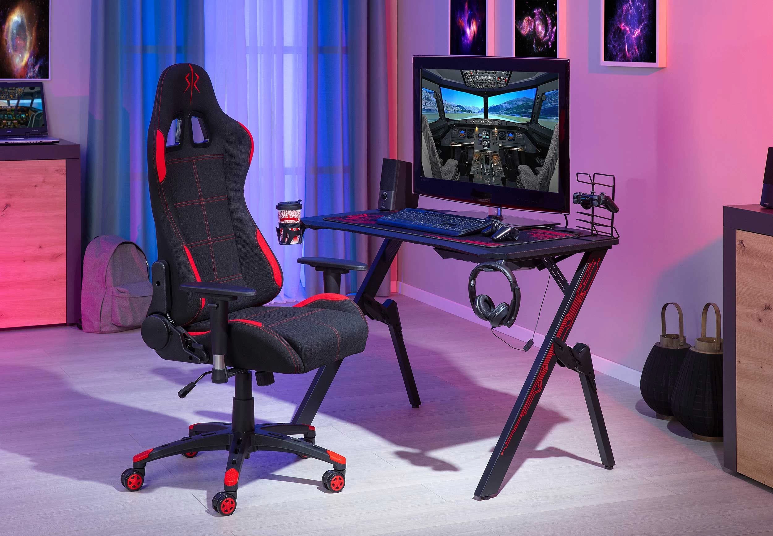 Zwart-rode gaming bureaustoel Frasso, gemaakt uit kunststof en nylon.