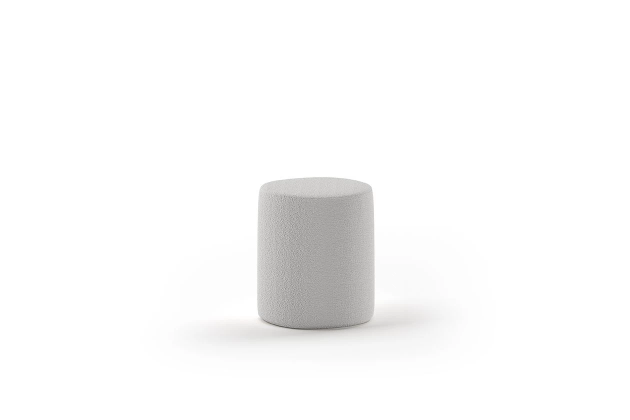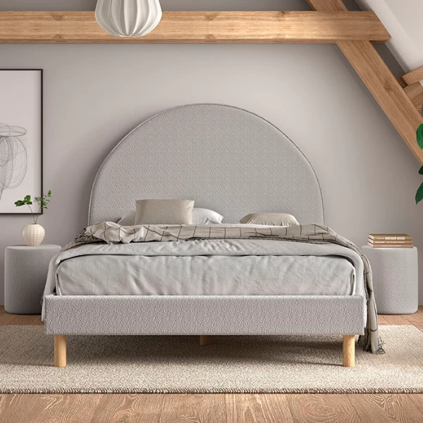 Twijfelaarbed Maeva 213x148x132cm met twee poefs ø41×41,5cm uit spaanplaat, bekleed met grijze bouclé stof. Voorzien van een lattenbodem van 140x200cm. Matras niet inbegrepen.