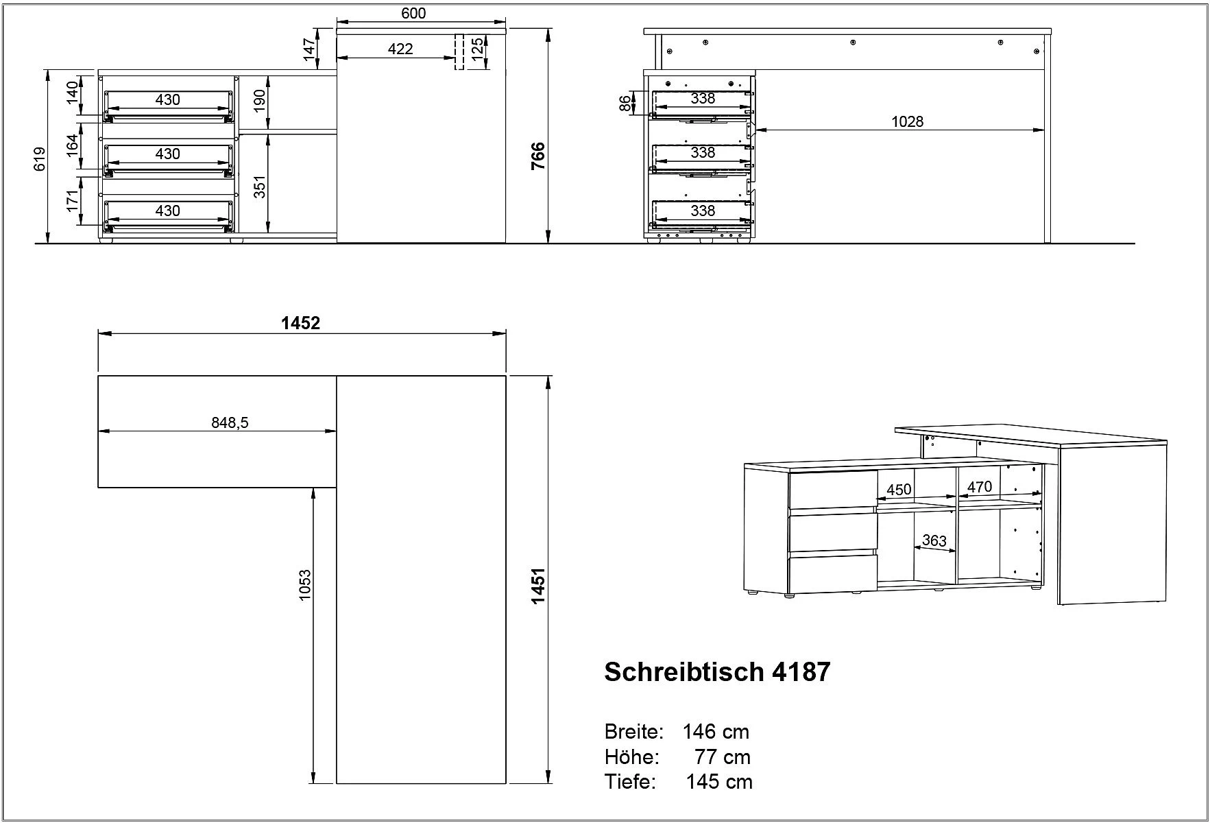 Hoekbureau Miguel, gemaakt uit gemelamineerde spaanplaat. Met kast. 146x145x76 cm.