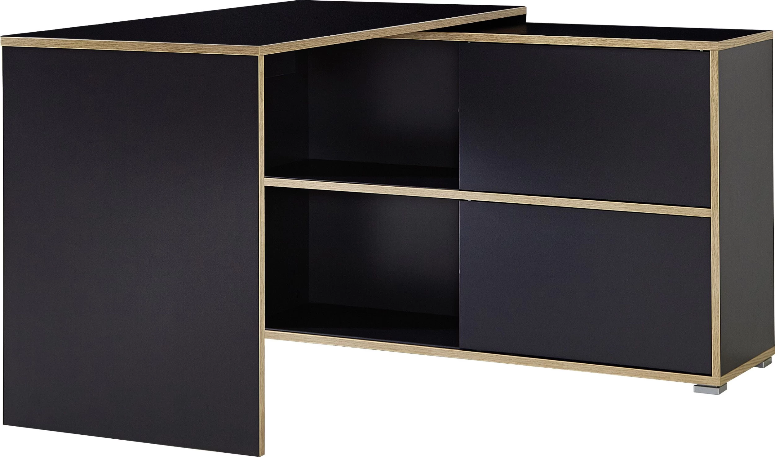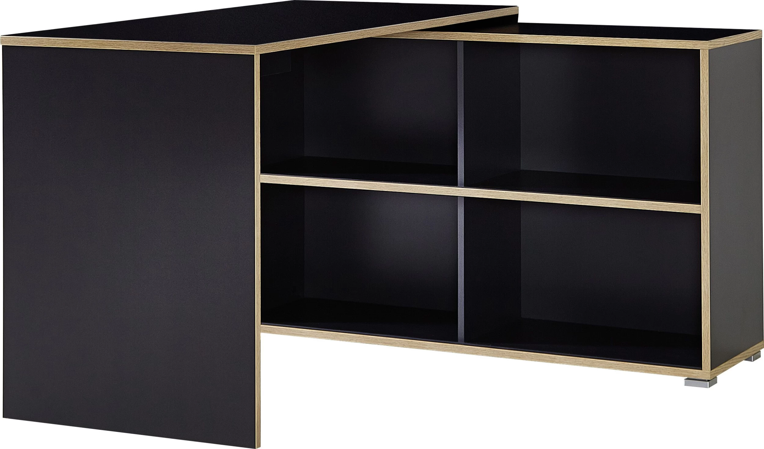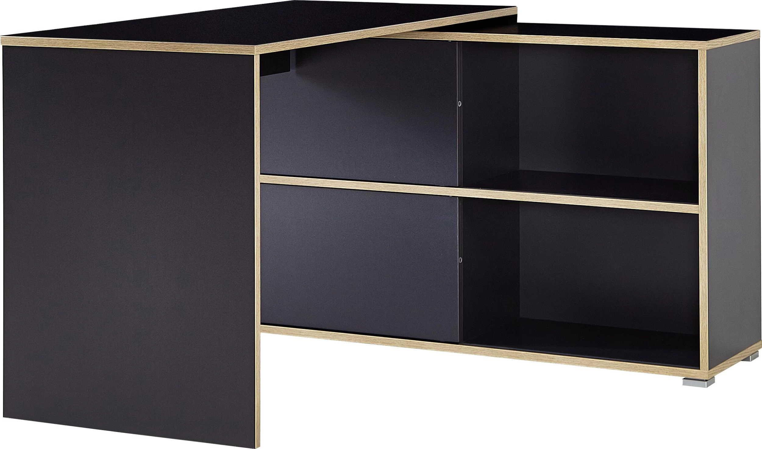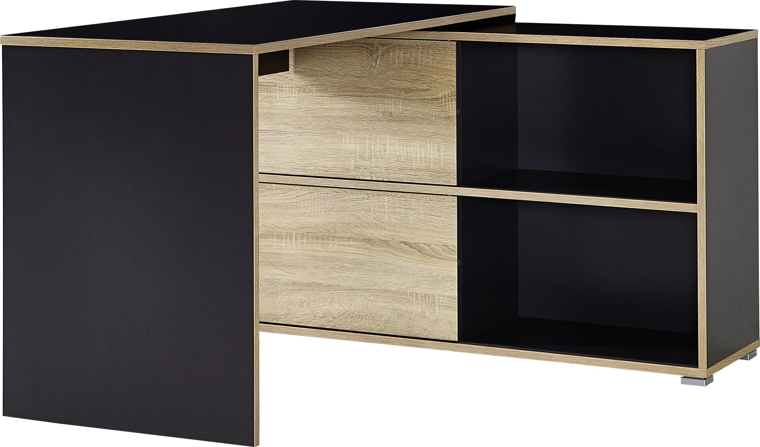 Hoekbureau Tyson in donker antracietkleur met verschillende opbergmogelijkheden in eikdecor. Meubel gemaakt uit gelamineerde spaanplaat.