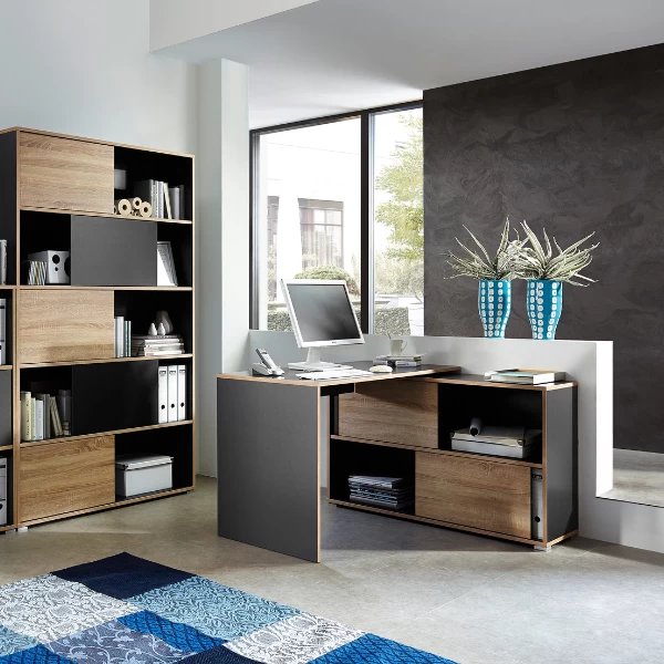 De Tyson-reeks is ideaal voor hen die af en toe nood hebben aan afwisseling. Dit hoekbureau is de perfecte combinatie tussen creativiteit, design en toch een erg functioneel meubel. De geïntegreerde kast is voorzien van vier legplanken met twee schuifdeuren. Het leuke aan de schuifdeuren is dat ze aan de ene kant in eikdecor zijn afgewerkt en aan de andere kant in het antraciet. Je kan dus kiezen welke kant je aan de buitenkant gebruikt, waardoor je een speels effect kan krijgen zoals op de foto’s.