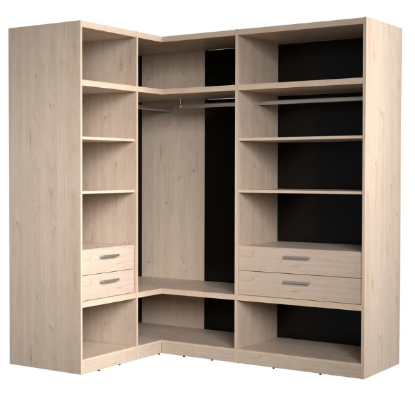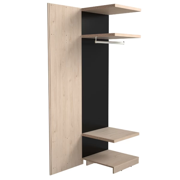 Hoekdeel voor dressingcombinatie Playa 118x60x220cm uit spaanplaat afgewerkt in eikdecor. Achterwand met melamine in wit of zwart. Uitgerust met twee legplanken en een kledingroede.